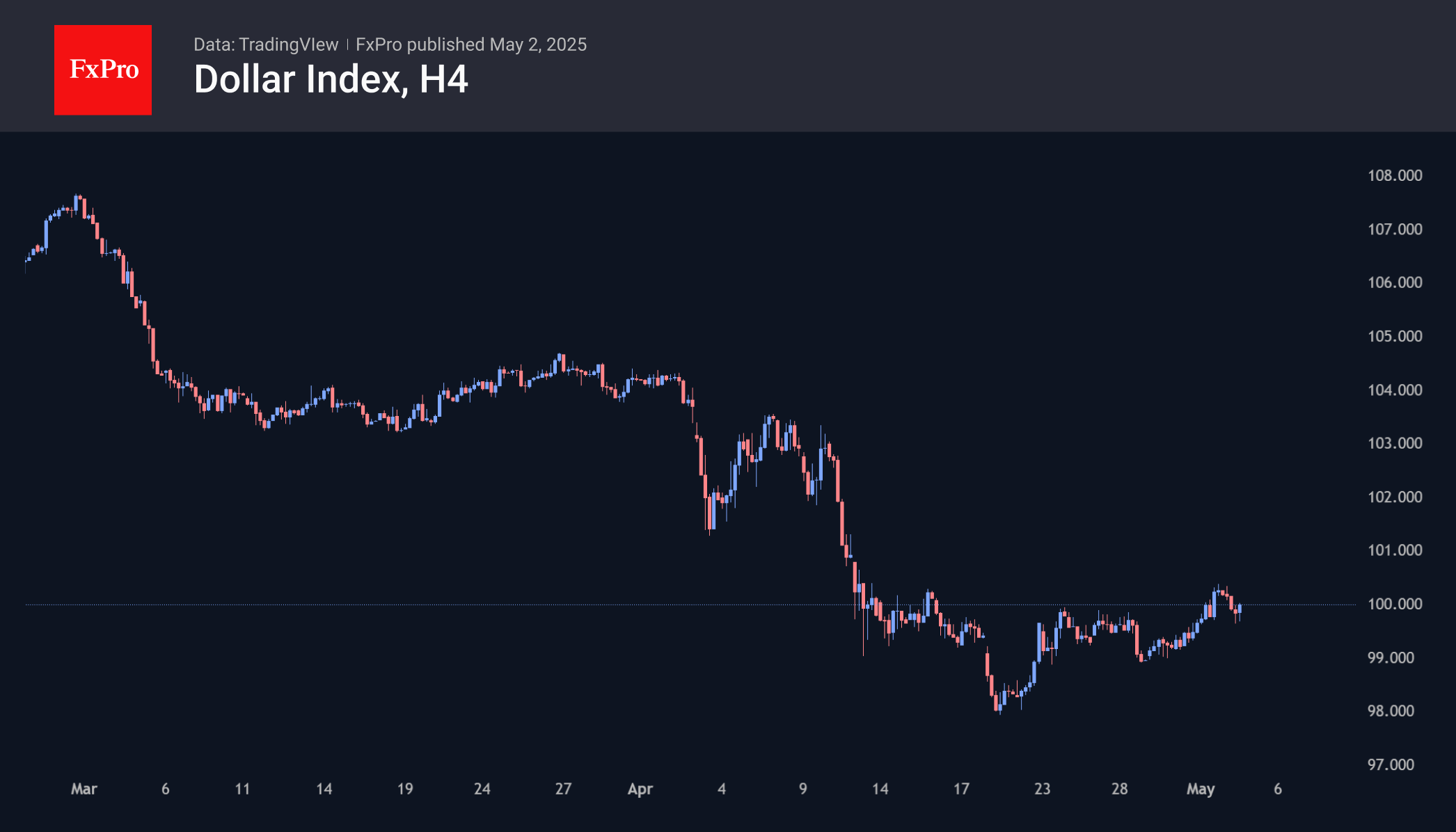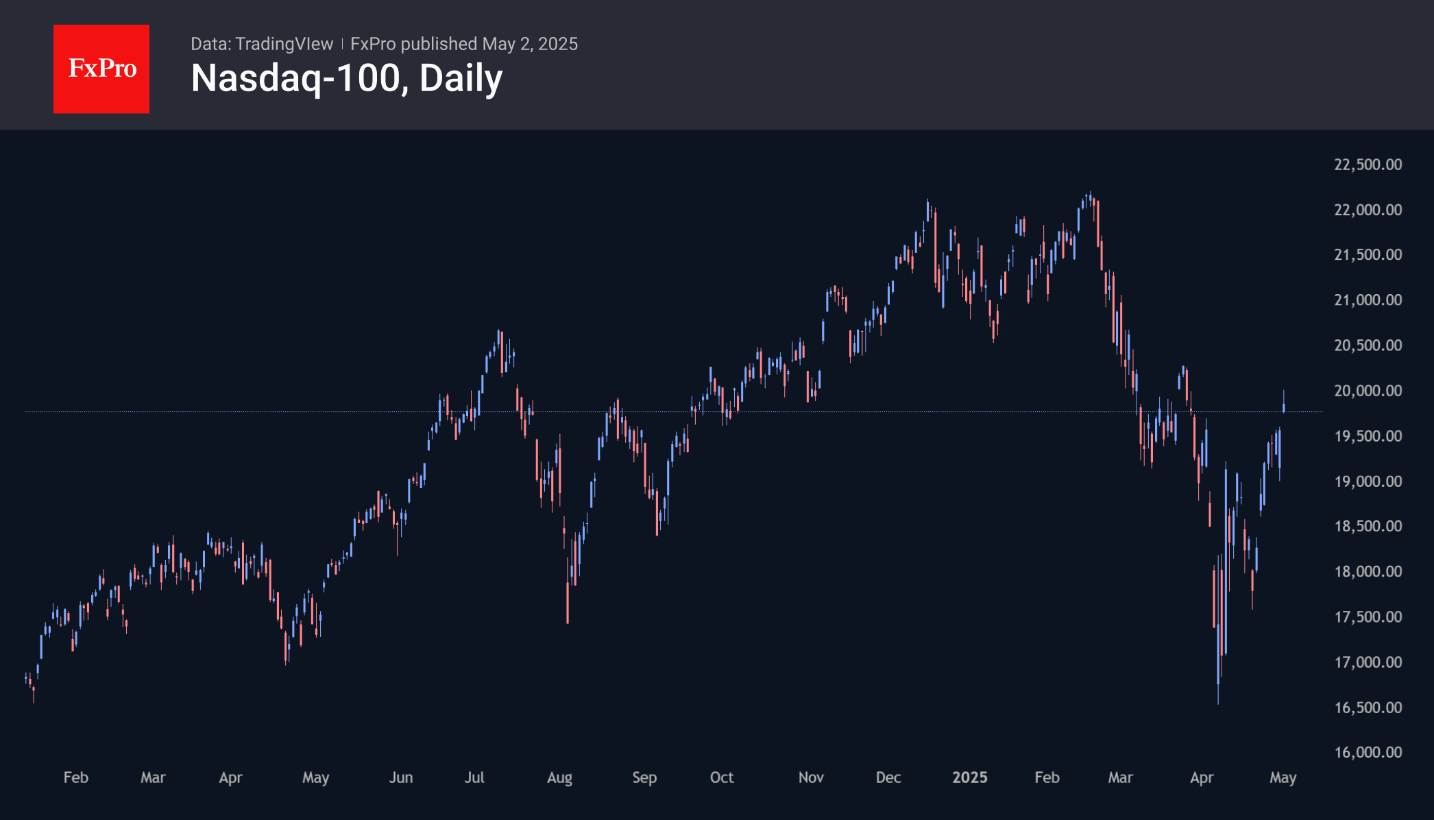 Индексы США растут вторую неделю подряд с ростом Nasdaq100 примерно на 3%, а S&P500 около 2.5%. Среда оказалась переломным днём, когда 2.5% внутридневной провал к концу дня был выкуплен за счёт ралли на 4.3% в течение семи часов. Причиной спада стали заголовки о сокращении экономики США за первый квартал, что рассматривалось как первые пугающие результаты влияния торговых войн.