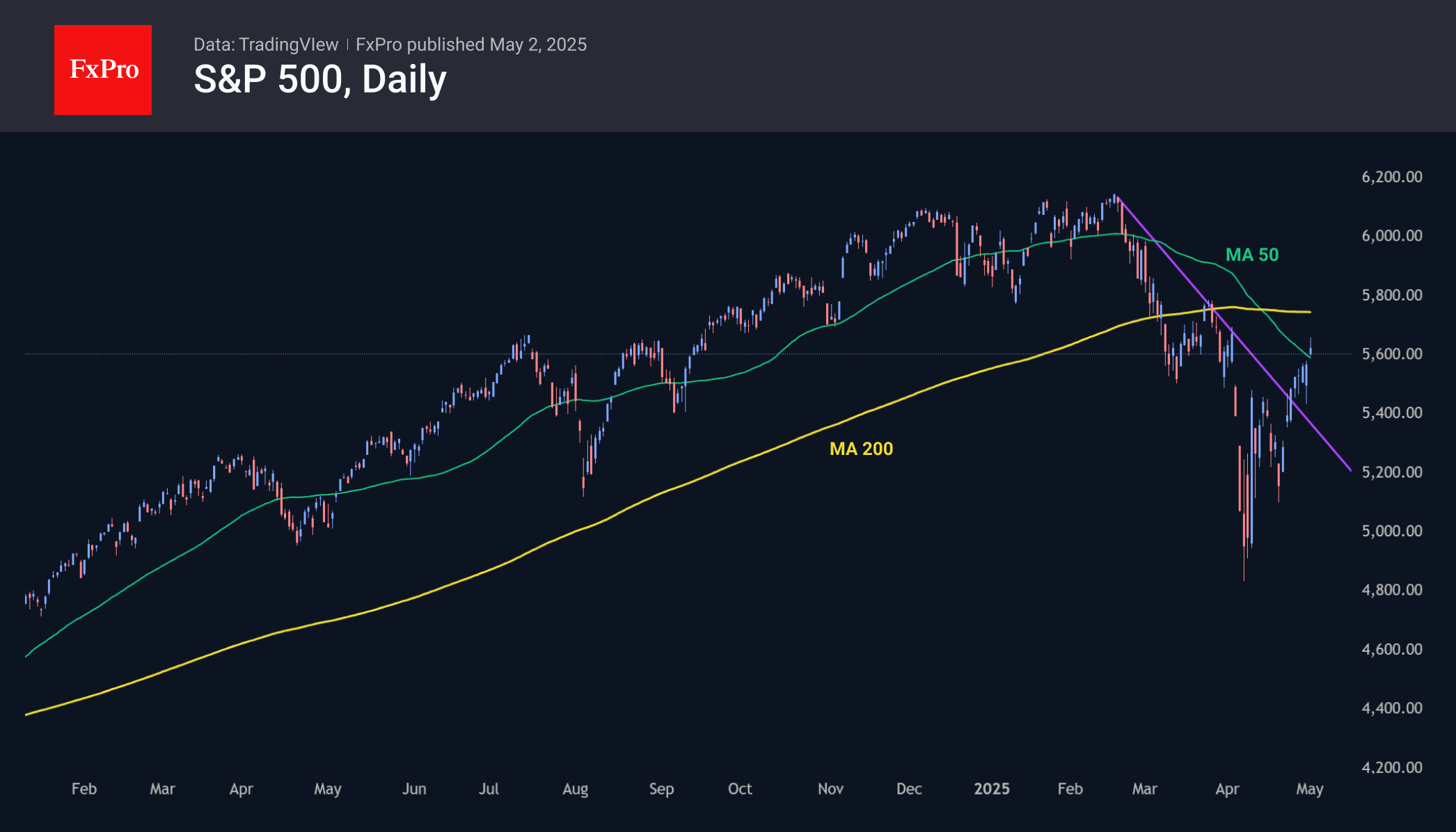 S&P500 уверенно преодолел линию нисходящего сопротивления, активную с февраля, и проделав 9% ралли за последние 8 сессий, закрепляется над 50-дневной средней.