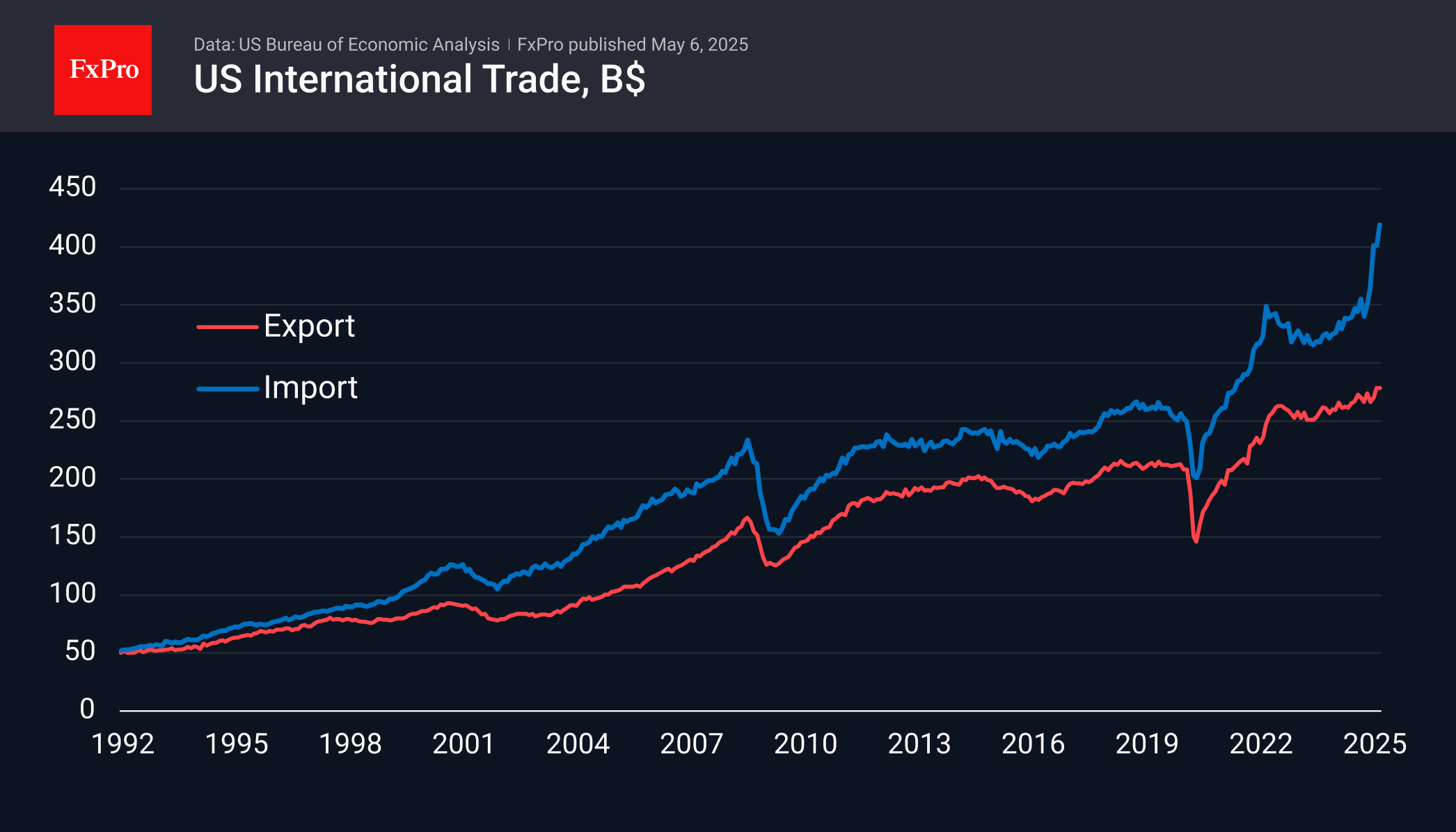 Торговый дефицит США с другими странами взлетел до исторических высот в марте, что было попыткой купить товары до введения тарифов. Напомним, что шокирующее выступление президента США с табличкой тарифов в «день Освобождения Америки» и последующие тарифы глаз-за-глаз – это уже апрельская история.