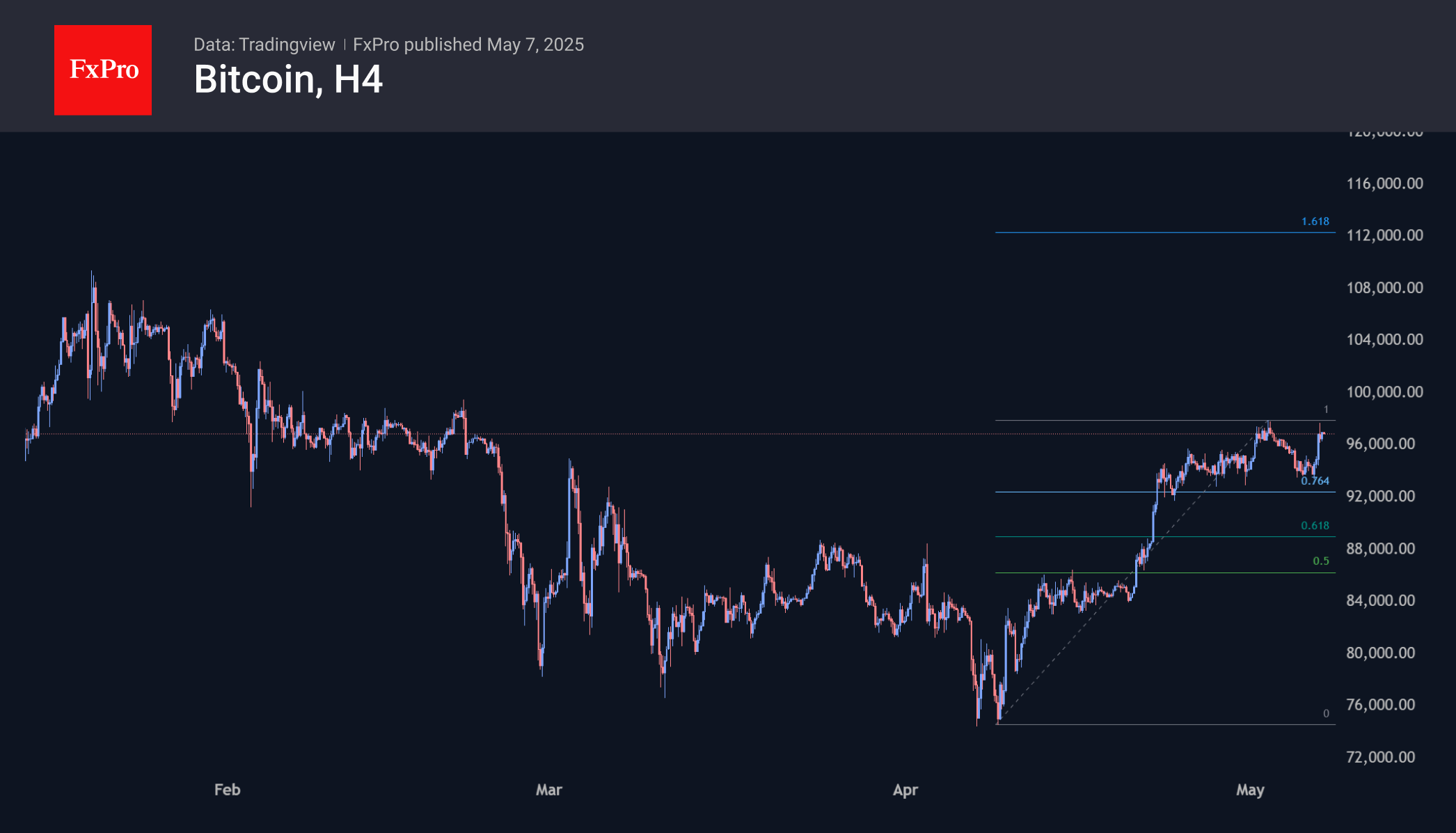 Биткоин значительно вырос на сообщениях о событиях в Индии и Пакистане, ненадолго превысив уровень $97.5K. Этот импульс роста пока не нашёл поддержки в других активах – золото дешевеет, индекс акций преимущественно снижается. Возможно, в ближайшее время штурм локальных максимумов продолжится. Закрепление выше $98K может запустить сценарий роста до $112K.