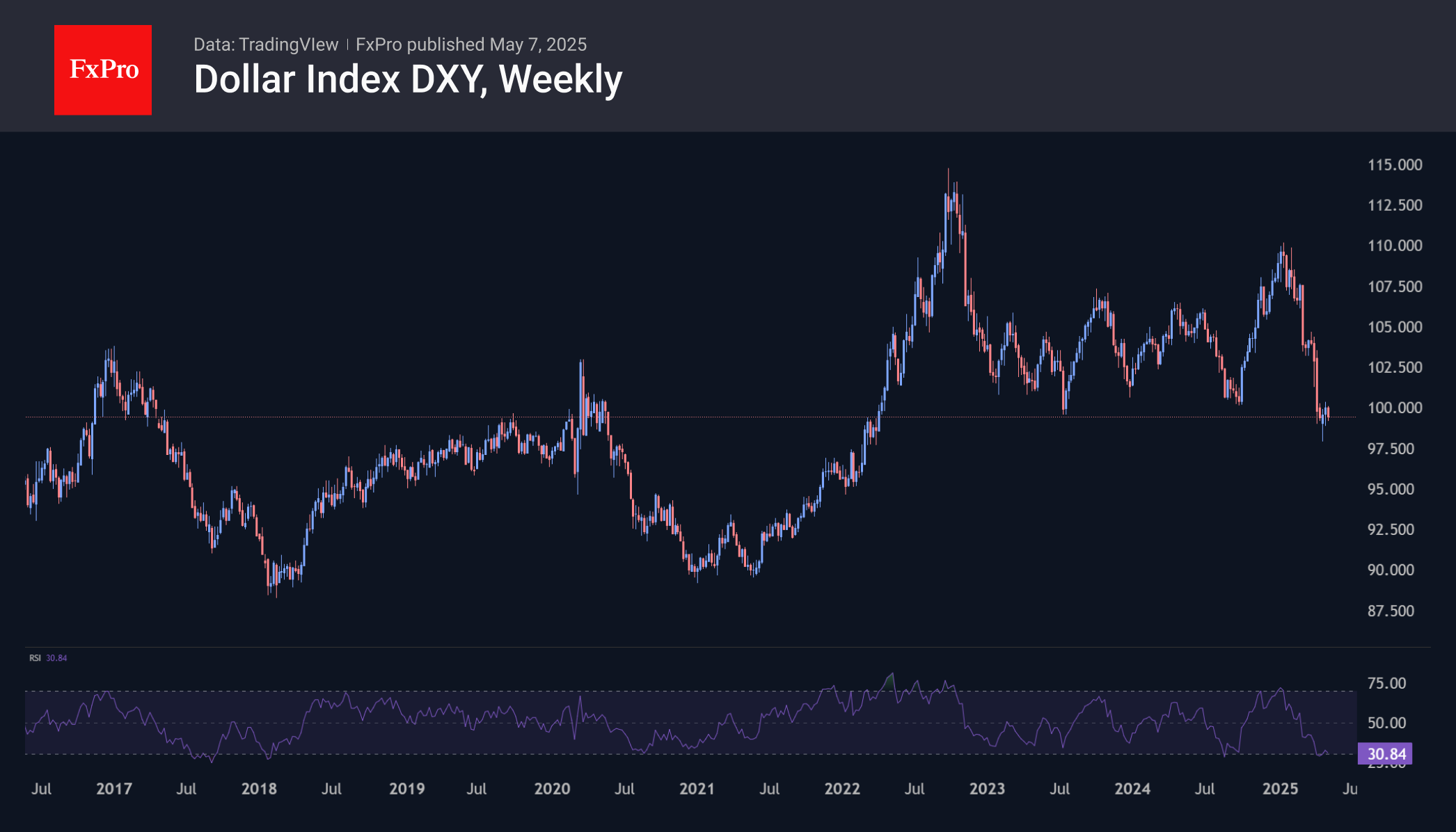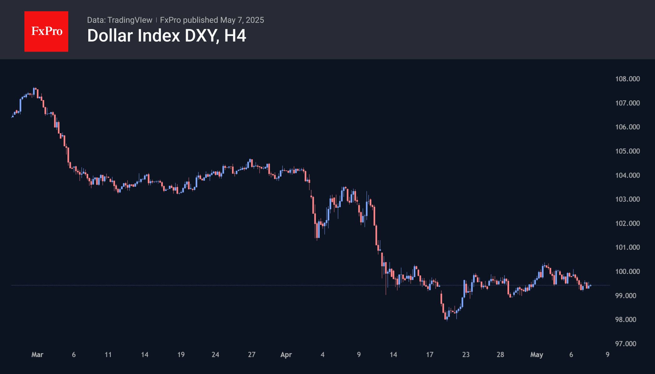 Ожидания по поводу ставок на июньское заседание сместились в пользу "без изменений", вероятность такого исхода составляет 70% против 0.8% месяцем ранее. Это поддерживало курс американской валюты. Индекс DXY остаётся на том же уровне, что и 11 апреля, после снижения на фоне торговых конфликтов. ФРС может сохранить настороженный тон в отношении инфляции, что поддержит доллар, но основное влияние на курс USD оказывают тарифные споры.