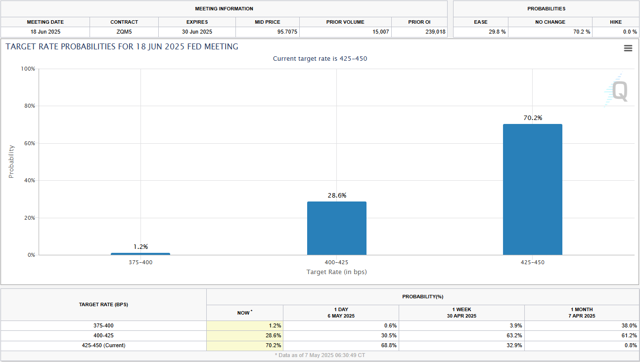 Рынки ожидают результатов заседания ФРС. Экономисты и аналитики единодушны во мнении, что изменения ставки не предвидятся, и она останется в текущем диапазоне 4.25%-4.50%. Несмотря на события в Индии и Пакистане, а также новости о предстоящих переговорах между США и Китаем, рынок готов к сильным движениям, оставаясь в состоянии неопределённости относительно дальнейших шагов Центрального банка.