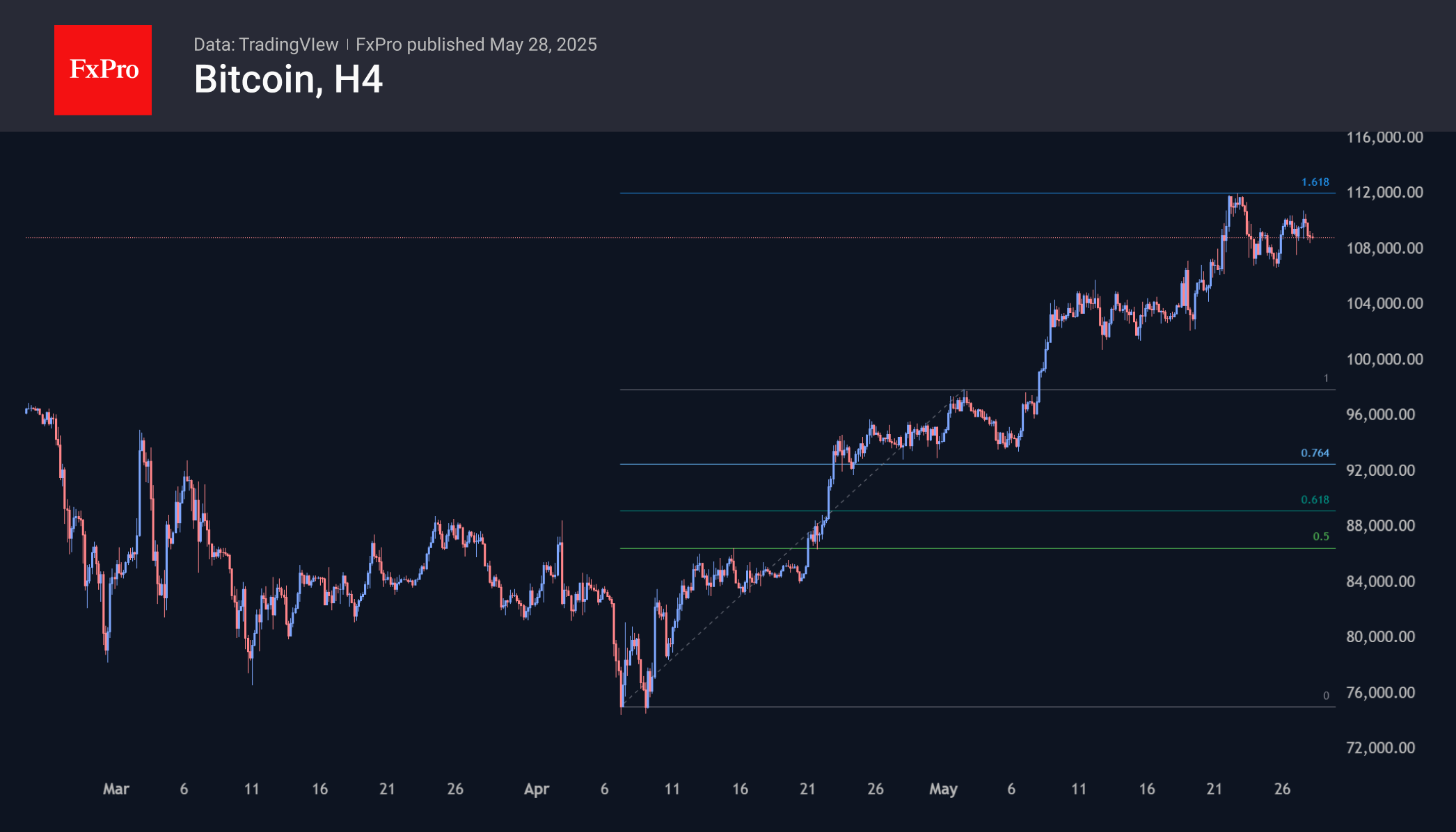 Биткоин с 22 мая проторговывает 5% диапазон между $106.6K и $111.7K, находясь в текущий момент в середине диапазона. Текущая область максимумов вписывается в паттерн расширения по Фибоначчи на уровне 161.8% от первого импульса роста с начала апреля по первые дни мая. Преодоление отметки 112 тыс. в таком случае будет прологом роста к 134 тыс. (261.8%).