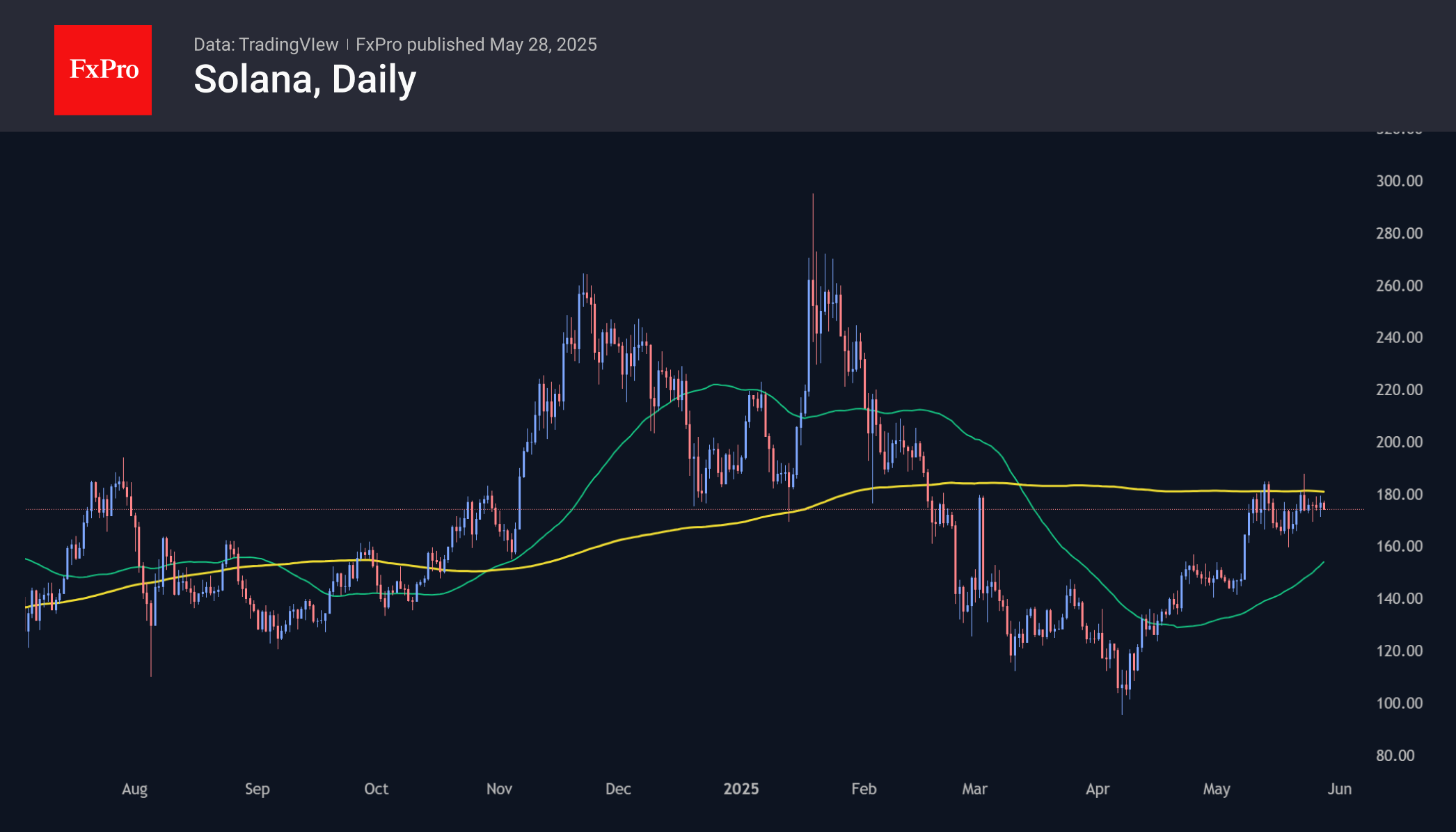 Ethereum и Solana уже более двух недель бьются с сопротивлением в виде своих 200-дневных скользящих средних. Похоже, мы имеем дело с нерешительностью рынка, которому приходится выбирать между дальнейшим могучим ралли и затуханием после отскока. Ралли Биткоина способно вдохновить крупные альты на прорыв, но пока его приходится ждать.