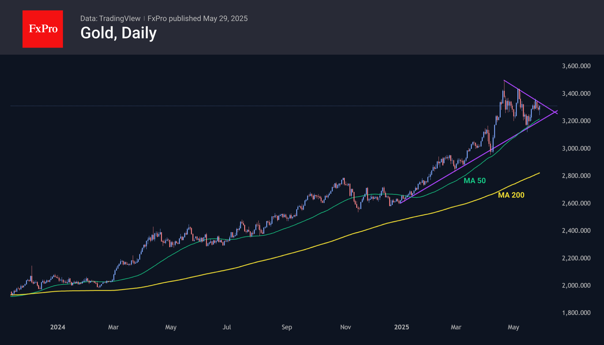 Золото при этом сумело остаться в рамках паттерна этого года. Золото активно выкупали на внутридневном провале ниже $3250, очередной раз оттолкнув цену от 50-дневной скользящей средней. Динамика впечатляет, так как цена прибавляет около 2% к внутридневным минимумам, достигнув $3310 за унцию. В апреле и ранее в мае цена уже отскакивала от этой кривой, формируя последовательность более высоких локальных минимумов.