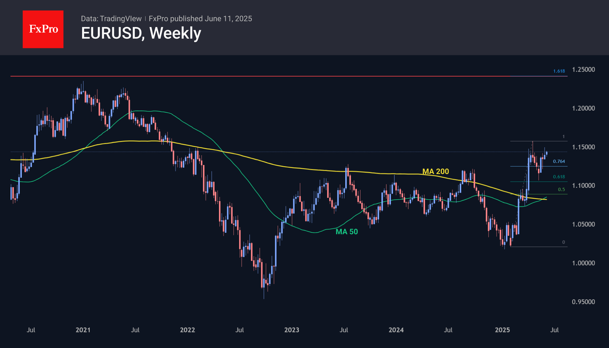 Единая валюта на протяжении месяца демонстрирует тенденцию всё более высоких локальных снижений. Импульсы роста в апреле и ранее в июне упирались в невидимый мягкий потолок на подходе к 1.15, но это выглядит лишь временной перетряской позиций после внушительного повышения и перед дальнейшим ростом.