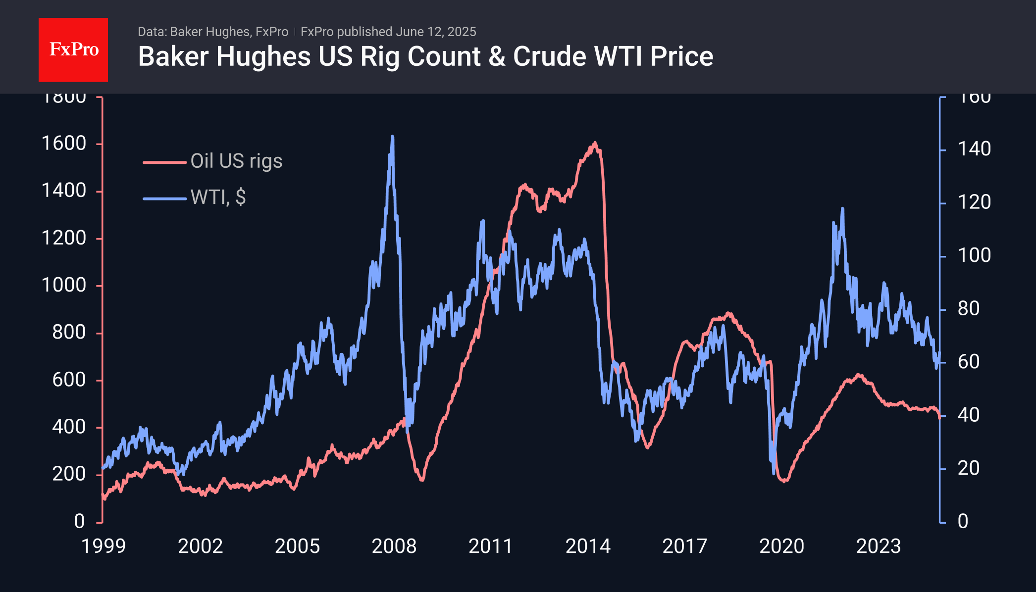 Ранее отчёты Baker Hughes указывали на значительное сокращение работающих нефтяных буровых до 442 штук (минимум за почти 4 года) против примерно 486 в среднем в марте-апреле. Это явный переход к сокращению после периода стабилизации, что обещает снижение добычи в последующие кварталы. Похоже, что Америка будет возвращать обратно Саудовской Аравии или ОПЕК+ долю рынка, отобранную после 2020 года.