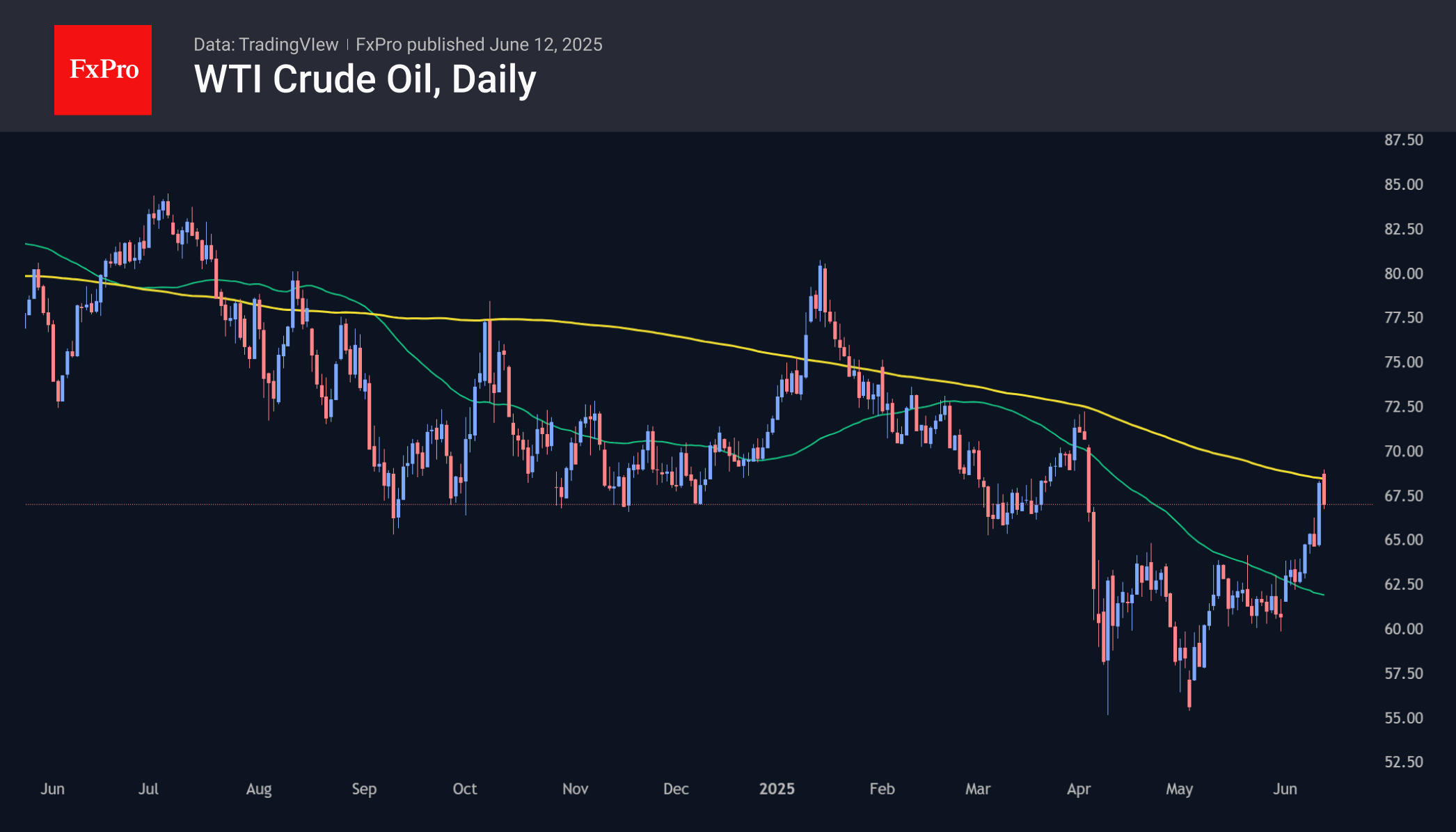 В своём росте цена нефти марки WTI приблизилась к 200-дневной средней, как мы это видели в самом начале апреля. Внушительная распродажа на приближении к этому уровню говорит, что медведи сохраняют контроль над рынком, невзирая на новости. Исключая пару недель в начале года, эта направленная вниз линия выступает в роли эффективного сопротивления с августа прошлого года. Территория медведей простирается вплоть до уровня $70, преодоление которого будет важным сигналом смены настроений. А до тех пор рост нефти может оставаться возможностью продать на росте.