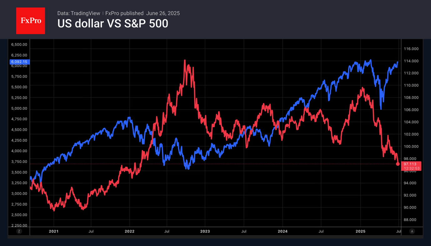 Конфликт на Ближнем Востоке вернул американскому доллару корреляцию связь с уровнем страха. И это его погубило. Обратная корреляция с фондовыми индексами США в условиях роста глобального аппетита к риску толкнула DXY на обновление трёхлетних минимумов. Инвесторы воспринимают режим прекращения огня как окончание Двенадцатидневной войны Израиля и Ирана и покупают акции.