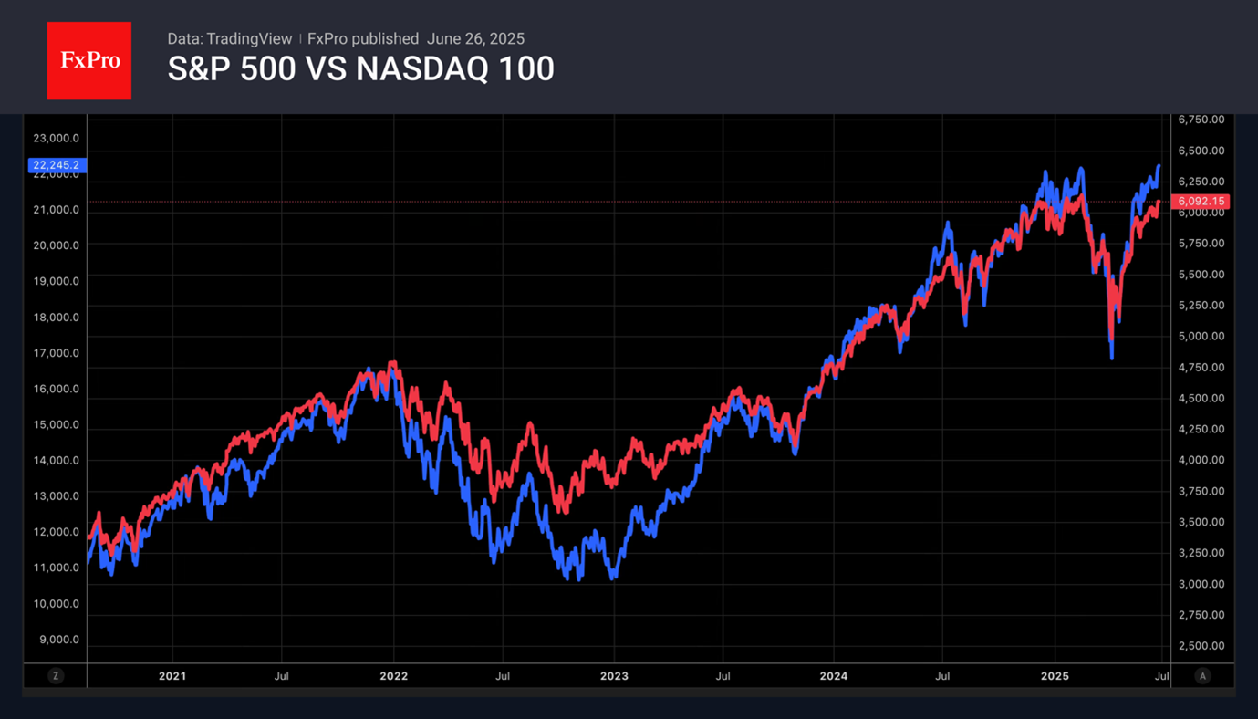 Деэскалация конфликта на Ближнем Востоке приблизила S&P 500 к рекордам. Новый виток интереса к искусственному интеллекту позволил Nasdaq 100 обновить исторические пики. Рост фондовых индексов США на исходе июня называют ралли технологических гигантов. NVIDIA обходит Microsoft по капитализации и вновь становится самой дорогой компанией мира.