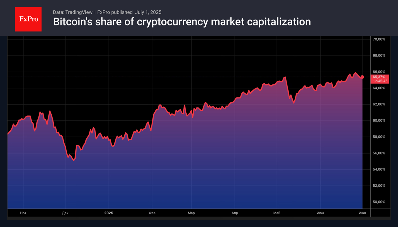 Биткойн поглощает основную часть приходящих на рынок цифровых активов денежных средств. Его доля в структуре рынка криптовалют увеличилась в первом полугодии 2025 на 10 п.п до 65%. Речь идет о самом высоком показателе с января 2021. Напротив, капитализация альткойнов с начала текущего года сократилась на $300 млрд. Благодаря развитой инфраструктуре, поддержке со стороны Белого дома и регулированию более крупные токены вытесняют более мелких конкурентов.