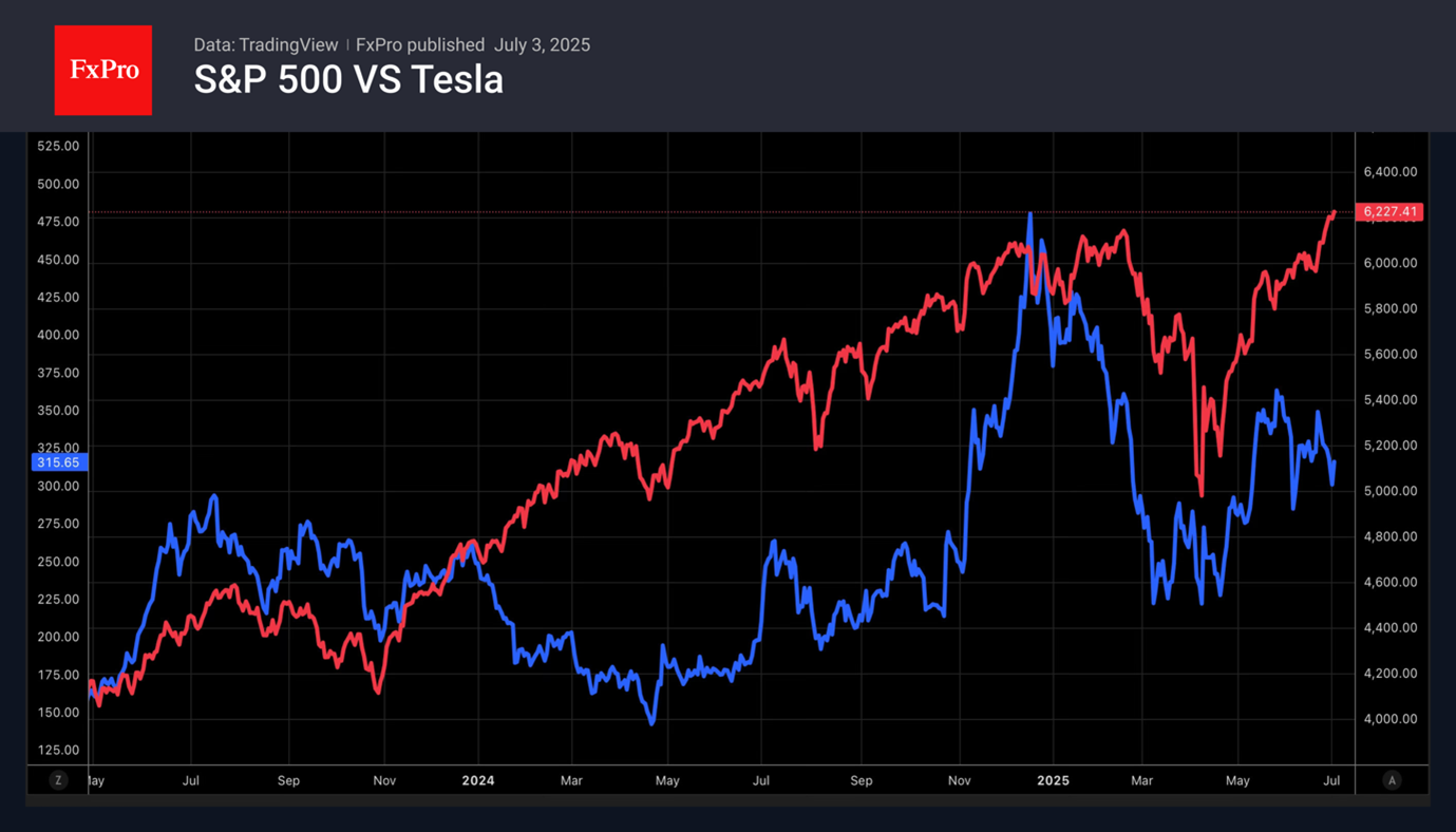 S&P 500 не устаёт переписывать рекорды. Широкий фондовый индекс игнорирует негатив и использует любую хорошую новость для ралли. Сокращение глобальных продаж Теслы на 13,5% привело к росту котировок акций компании на 5%. Инвесторы с оптимизмом восприняли факт увеличения ею инвестиций на технологии искусственного интеллекта. Замедление рынка труда воспринимается как повод для скорого снижения ставки ФРС. Заключение Дональдом Трампом сделки с Вьетнамом рассматривается как деэскалация торговых войн. Хотя страна и будет уплачивать тарифы по ставкам в 20-40%.
