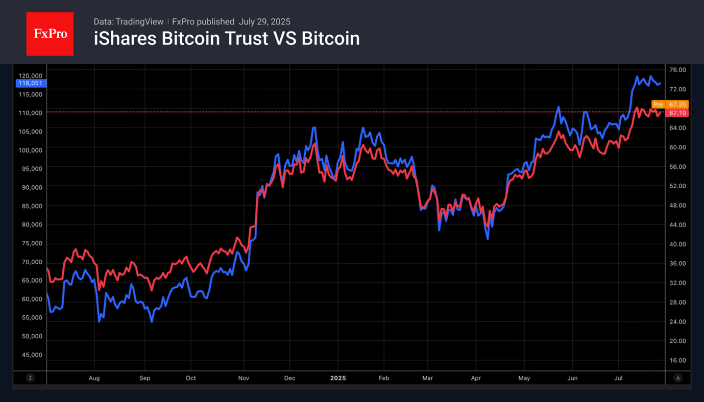 Лояльность Белого дома и создание нормативной базы подогревает спрос институциональных инвесторов к крипторынку. Открытый интерес к связанным с крупнейшим биткойн-ETF iShares Bitcoin Trust от Black Rock деривативами вырос в три раза до $34 млрд с начала 2025. Ежедневные объёмы торгов превышают $4 млрд. Более активно торгуются только высоколиквидные специализированные фонды американских акций и золота.