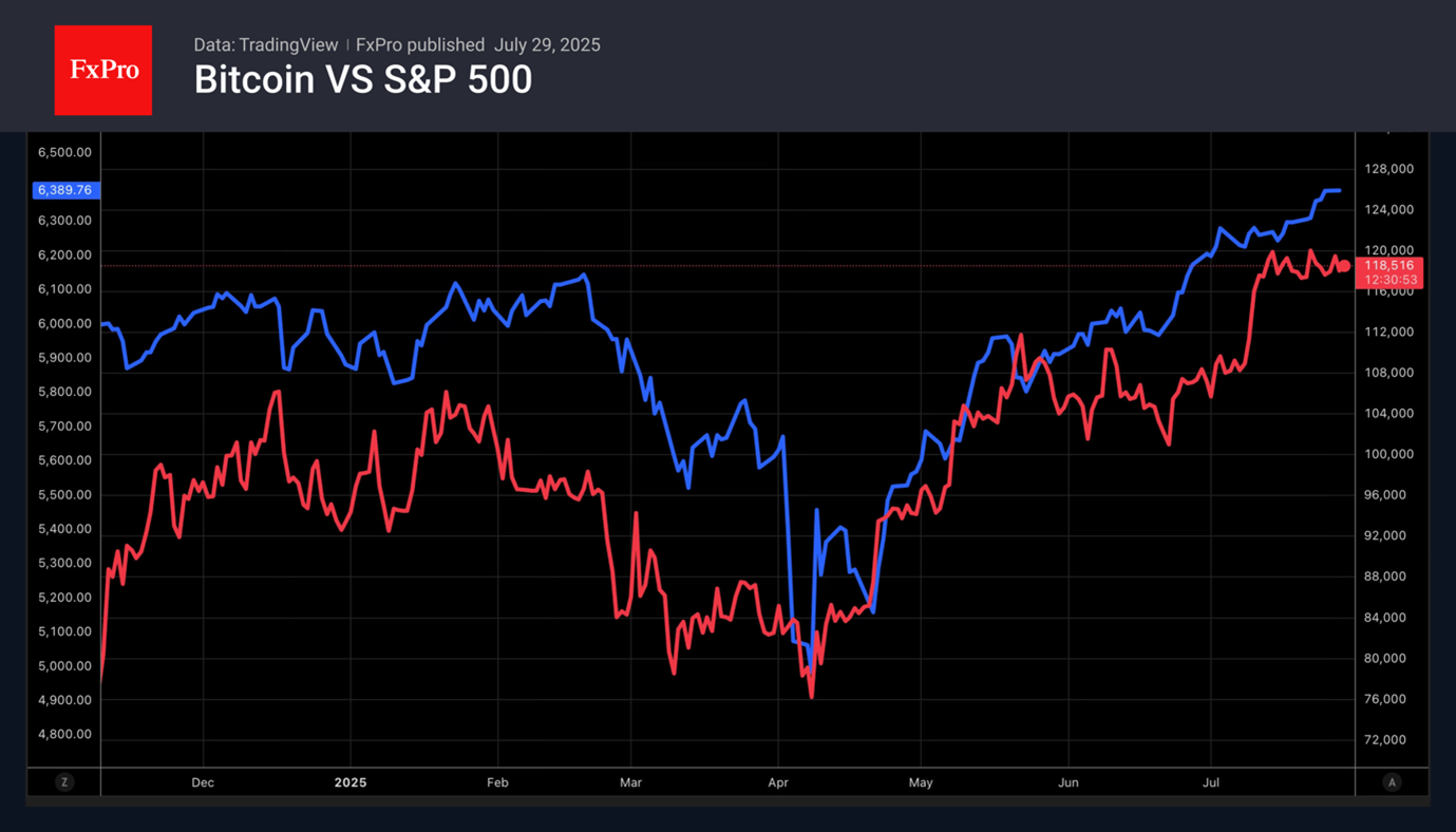 После бурного ралли в первой половине июля биткойн вошёл в состояние консолидации. Ему не помогают ни шестой подряд рекордный максимум S&P 500, ни связанное с ним улучшение глобального аппетита к риску. Вместе с тем, средне- и долгосрочные перспективы BTCUSD остаются «бычьими». Citigroup ожидает увидеть криптовалюту на уровне $135K к концу 2025.