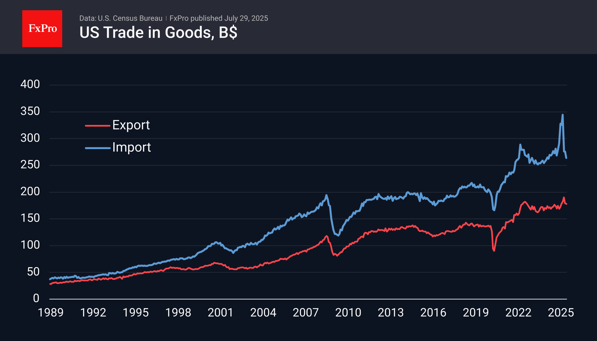 Торговый товарный дефицит США сократился в июне до $86 млрд против 96.4 месяцем ранее и пиковых 162 млрд в марте на падении импорта. Предвидя торговые споры, импортёры США начали резко наращивать закупки ещё в декабре, хотя и без того, всё второе полугодие 2024 года дефицит курсировал вблизи рекордных 100 млрд в месяц.