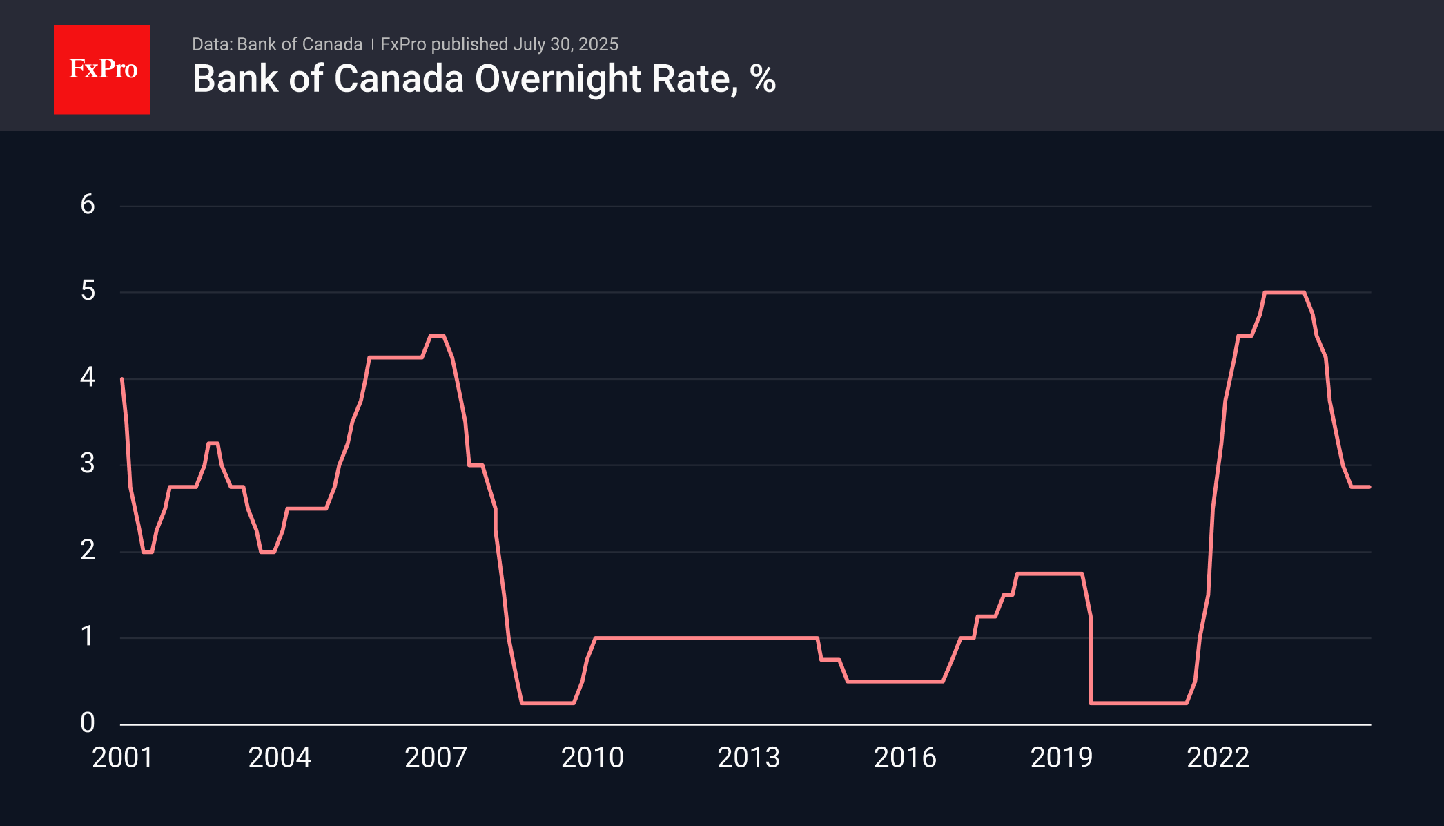 Банк Канады сохранил ключевую ставку неизменной на четвёртом заседании подряд на уровне 2.75%. Это пауза после довольно агрессивного снижения с 5% с июня прошлого года по март этого. Неопределённость, вызванная тарифными спорами с США, остаётся центральной темой для Канады и для его ЦБ, доминируя в официальном комментарии по ставке.
