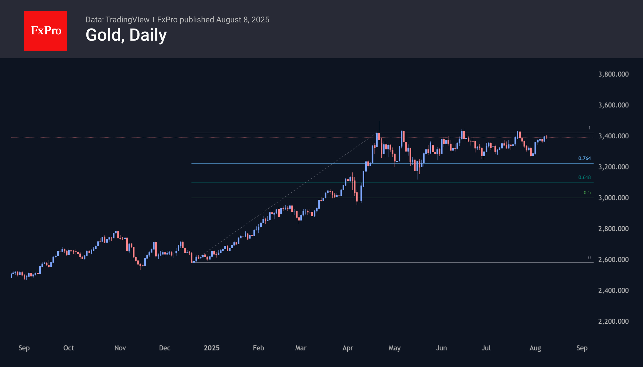 В случае прорыва верхней границы и старта бычьего ралли в золоте открывается потенциал проскальзывания вплоть до $3950-4000, где сосредоточены уровни расширения на 161.8% от повышения с минимумов в конце прошлого года по область сопротивления с конца апреля вблизи $3420.