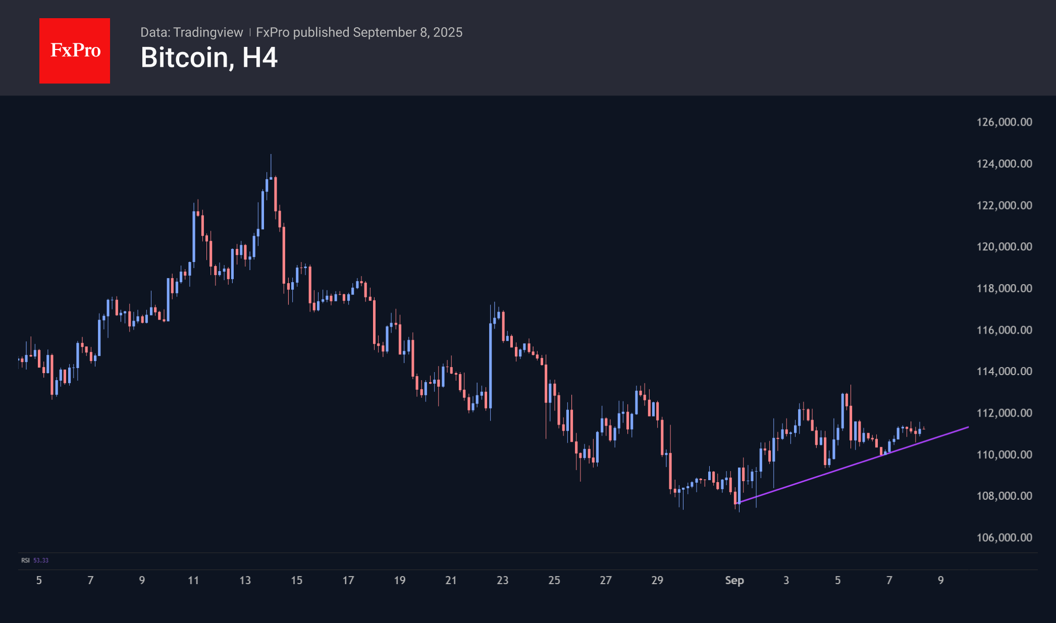 Биткоин продолжает топтаться вокруг $111K, ежедневно пересекая эту отметку вверх или вниз последние семь дней. С начала сентября через локальные минимумы цены можно провести повышательную линию, но BTC за всё это время прибавил около 3.6%, больше потерь за один лишь день 28 августа.
