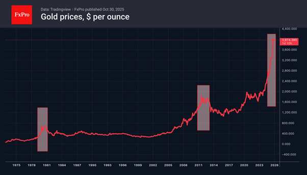 Укрепление американского доллара и повышение ставок по трежерис вернули котировки XAUUSD ниже 4000. Золото постепенно теряет свои козыри. Оно сумело достигнуть рекордного максимума благодаря торговле обесцениванием, ожиданиям агрессивной монетарной экспансии ФРС, угрозам Дональда Трампа о 100% тарифах против Китая, геополитике, пессимистичным прогнозам по мировой экономике и активным покупкам центробанками слитков.