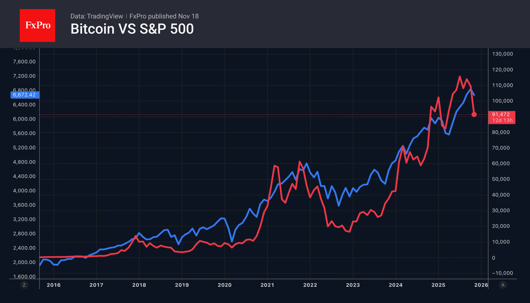 Действительно, обвал биткойна на 32% от пика в январе до дна в апреле был связан с объявлением Белым домом самых масштабных тарифов с 1930-х. В октябре Дональд Трамп пригрозил Китаю 100%-ми пошлинами на импорт, после чего котировки Биткоина рухнули на 28%. Тарифы несут в себе риски инфляции и мешают ФРС снижать ставки, ухудшая глобальный аппетит к риску.