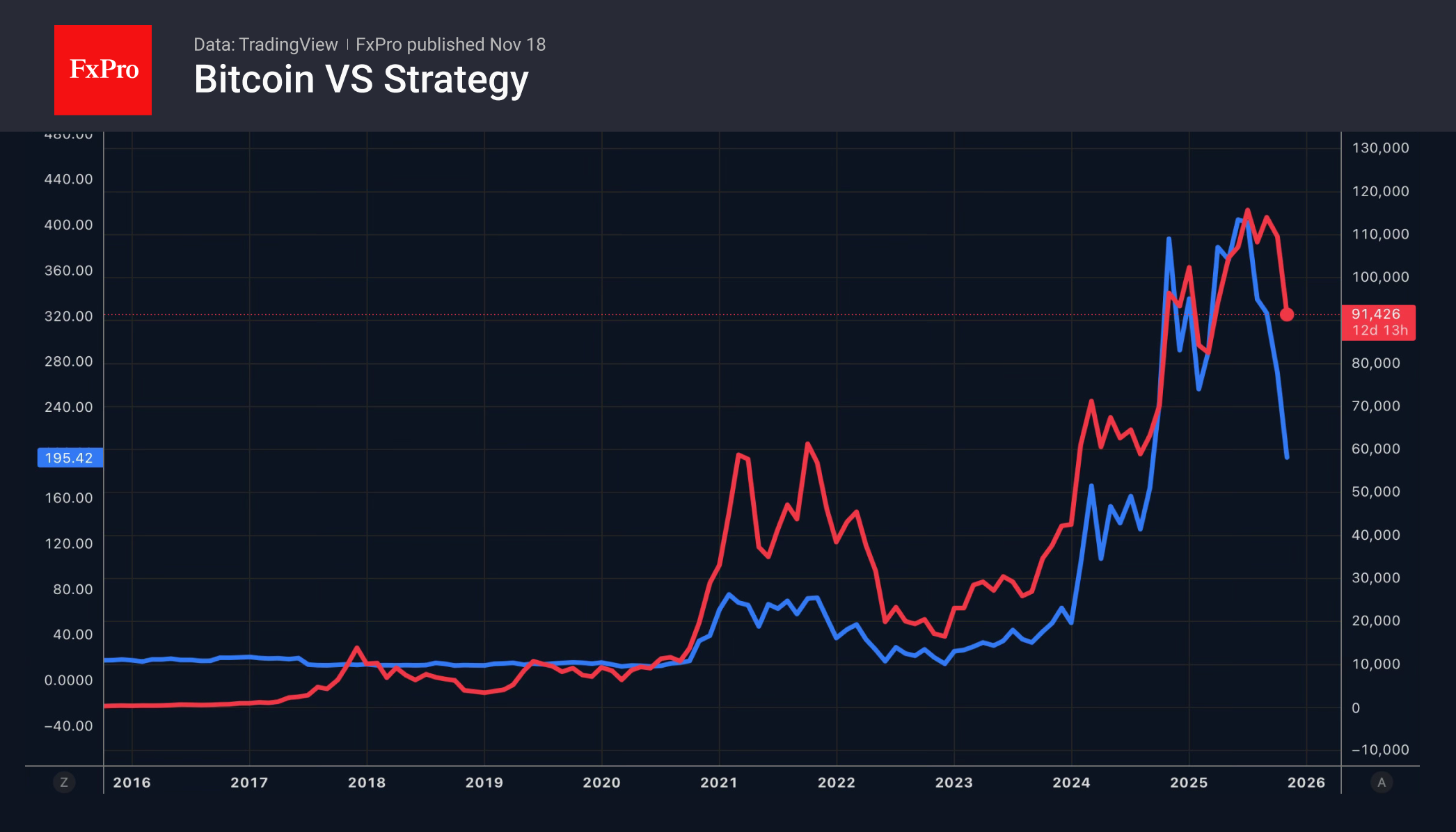Переход BTCUSD к медвежьему рынку создал проблемы институциональным инвесторам. В середине ноября капитализация Strategy опустилась ниже стоимости приобретённых ею биткойнов. Однако если компания Майкла Сейлора использует откат для покупок, то другие корпоративные казначейства стоят перед выбором, нести убытки или продавать.