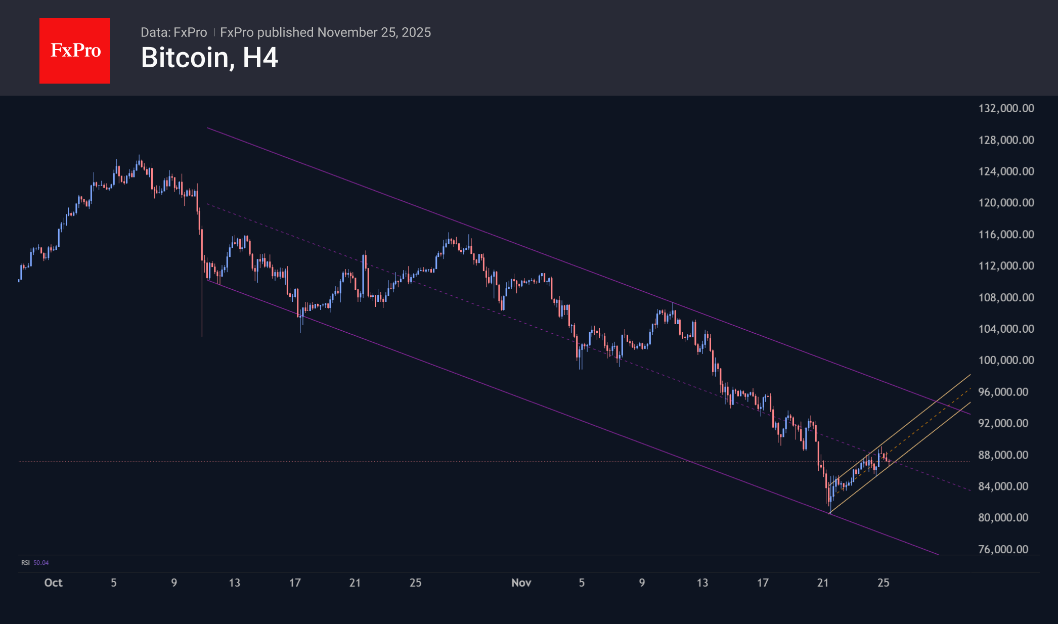 Биткоин поднимался до $89K на пике прошлой ночью, но откатился утром до $87K. BTCUSD с прошлой пятницы сформировал направленную вверх тенденцию, отскочив от её верхней границы ночью. Однако в последние семь недель биткоин всё же имеет резко-негативную динамику, в рамках которой последний рост выглядит отскоком. В данном случае будет разумно внимательно следить за признаками истощения отскока. Первым таким сигналом будет закрепление под уровнем $85K.