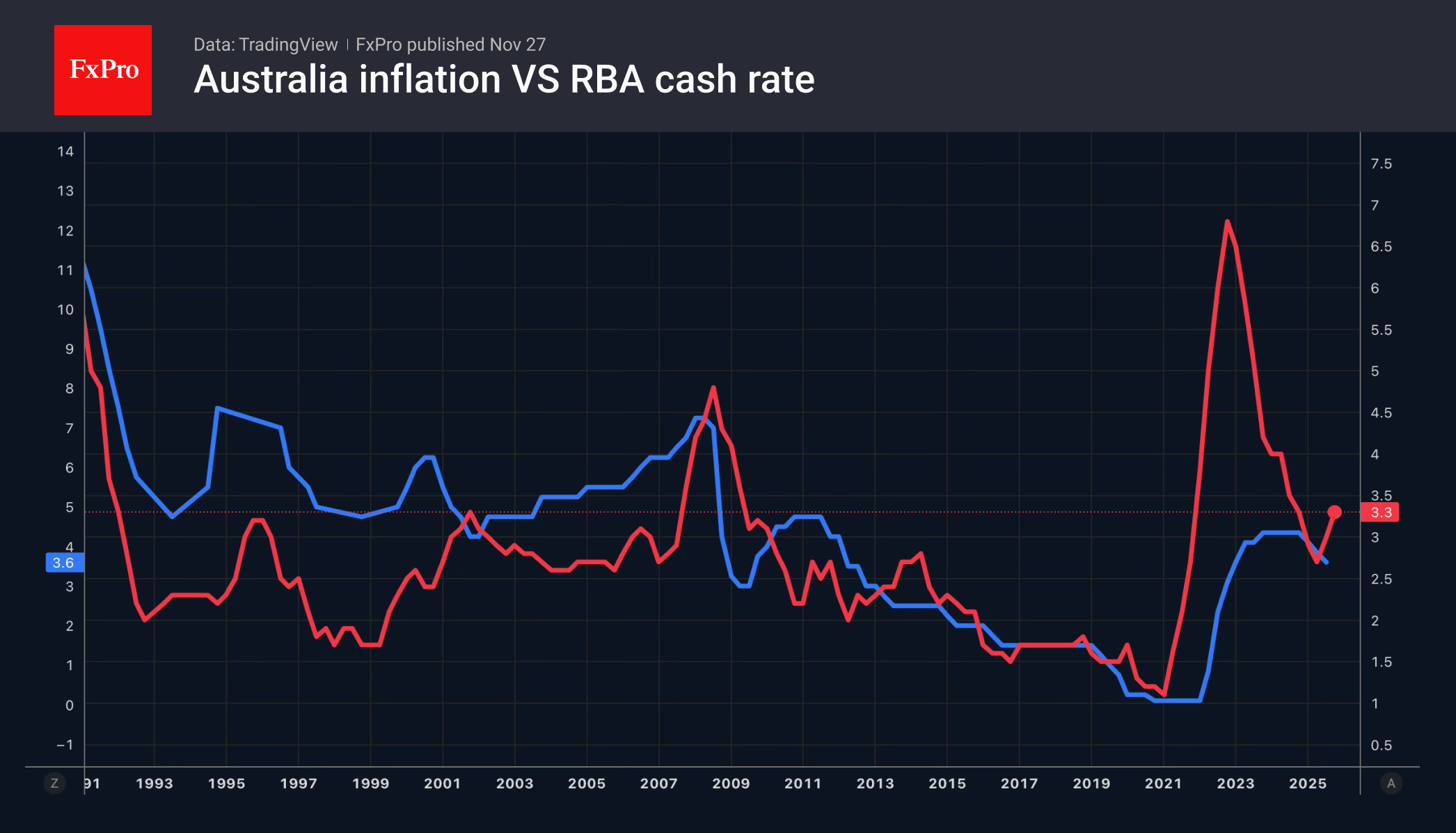На другом конце земли, в Австралии, ускорение инфляции до 3,3% в октябре может вынудить РБА повышать ставки. Годовые темпы роста CPI превысили не только прогнозы экспертов, но и верхнюю границу целевого диапазона Резервного банка в 2–3%. В результате некоторые инвестбанки стали утверждать, что следующим шагом тут будет ужесточение денежно-кредитной политики. AUDUSD ответила ростом.