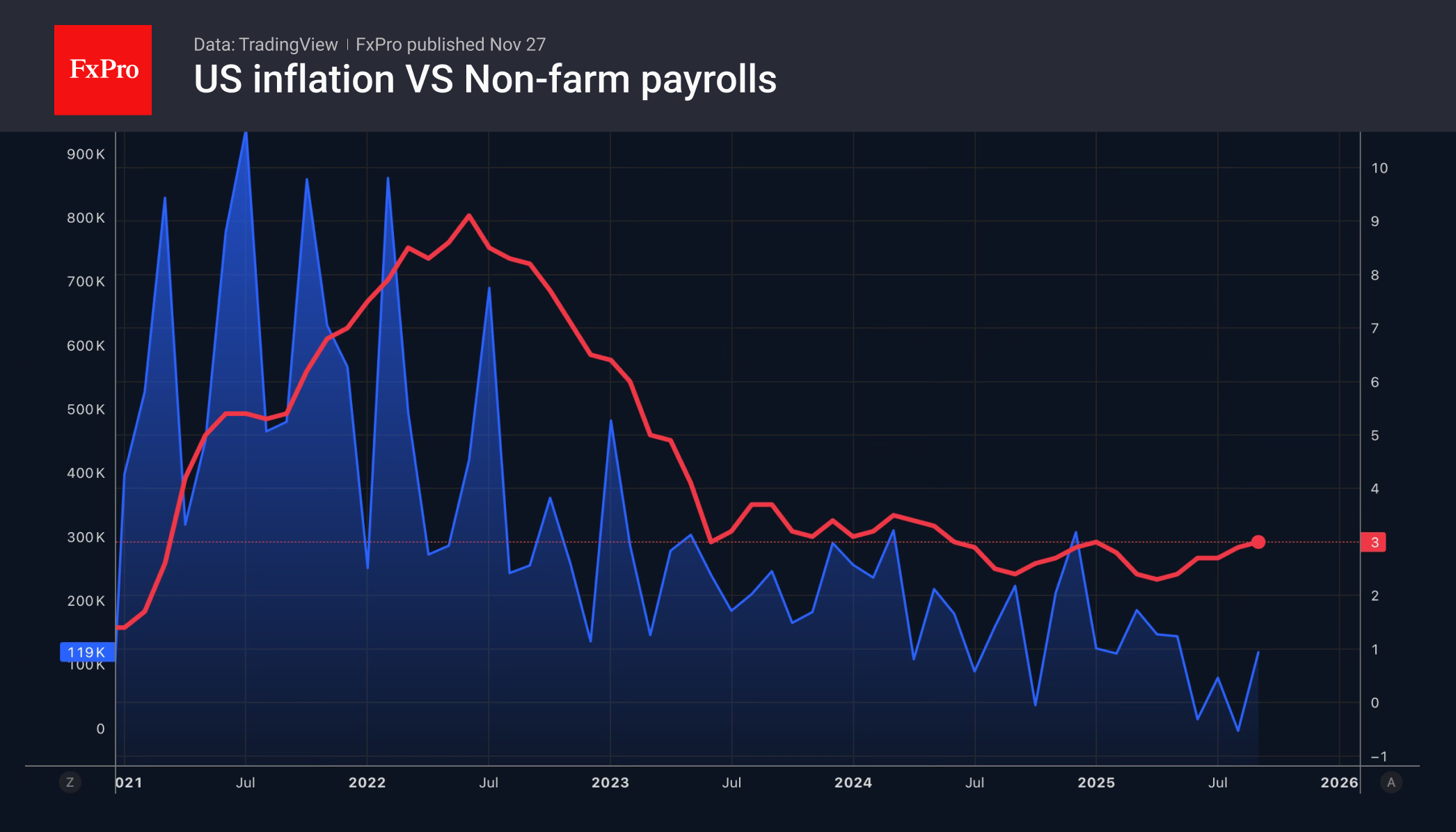 Эта точка зрения подтверждается данными. ADP сообщает о сокращении занятости в частном секторе в то время как другой отчёт по повторным обращениям за пособиями по безработицы вернулись к области 4-летних пиков. Опасения за судьбу рынка труда заставляют американцев затягивать пояса. В результате шансы снижения ставки ФРС в декабре подскочили до 85%, запустив падение доллара.