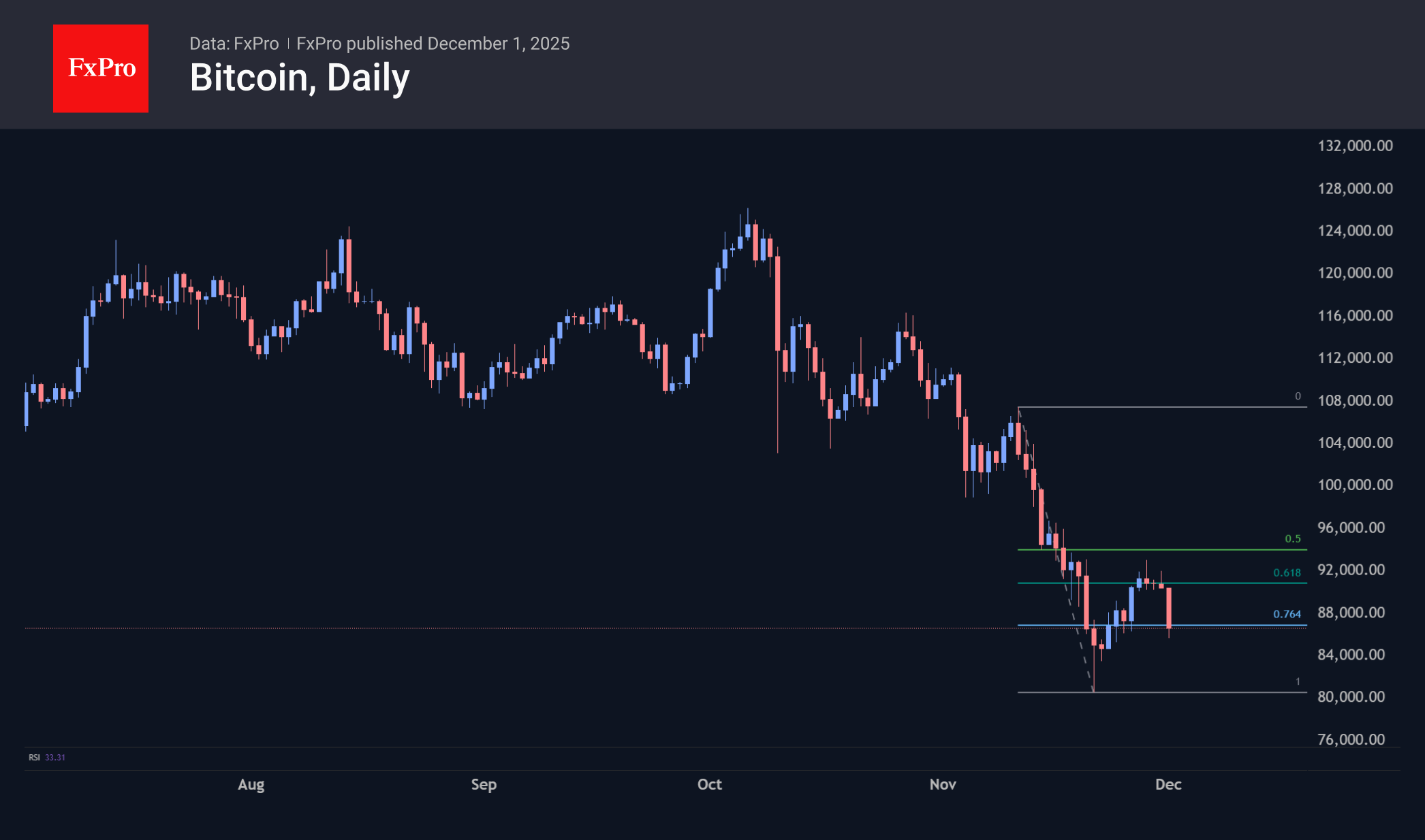 Биткоин провалился на страте дня к $85.5K, но отскочил до $86.7K на момент написания. Технически, вырисовывается медвежья картина, где первая криптовалюта резко пошла вниз после четырёхдневной консолидации у линии коррекции 61.8% по Фибоначчи. Строго говоря, сейчас можно лишь говорить, что быстрый отскок не получился, но сигнал снижения на $64K (161.8%) будет лишь на спаде ниже $80.5K.