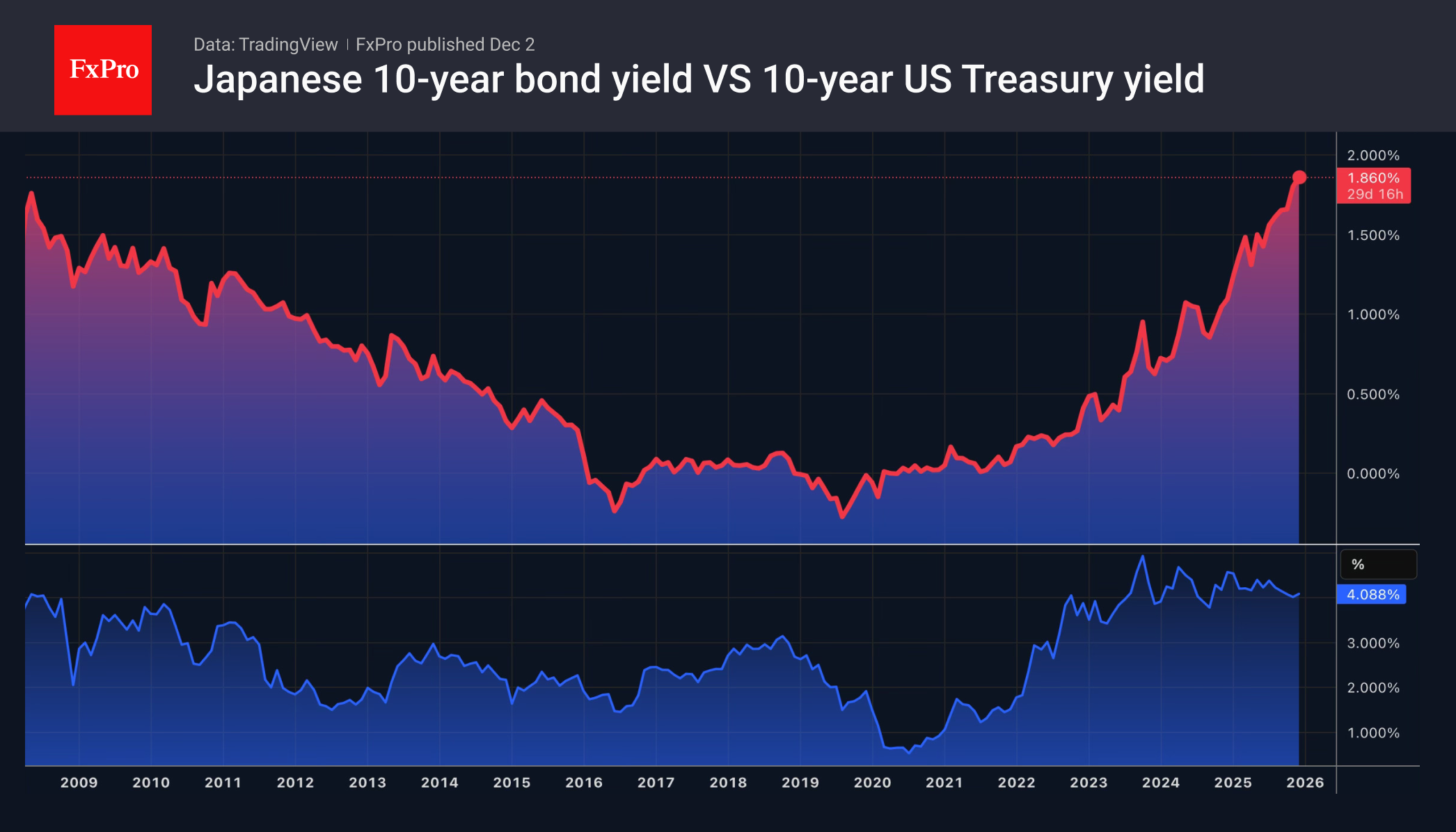Отступление основной валютной пары от двухнедельных максимумов обусловлено ралли доходности 10-летних казначейских облигаций США выше 4%. Инвесторы опасаются, что владеющая трежерис на $1,2 трлн Япония начнёт сбрасывать их с рук по мере роста привлекательности местных активов и репатриации капитала на родину. В эту сторону работает рост шансов повышения ставки Банка Японии в декабре на фоне «ястребиных» комментариев Кадзуо Уэды. В результате доходность японских 10-летних бондов взлетела до максимума с 2008.