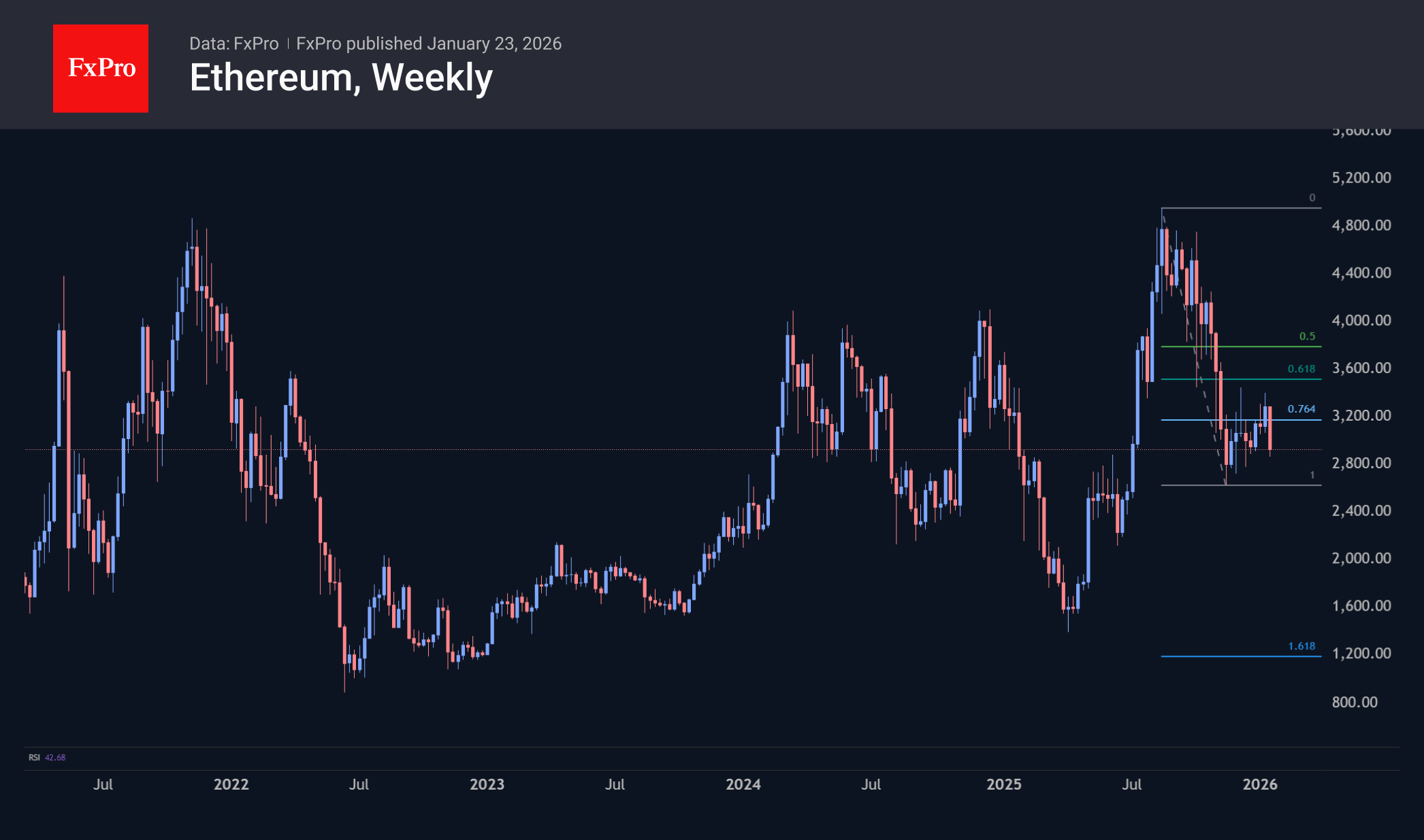 Ethereum с начала недели потерял вдвое больше биткоина – 12%, вновь оказавшись в области поддержки ноября и декабря. В мае и июне прошлого года тут же было активное сопротивление медведей, что усиливает внимание к борьбе за текущую область $2700-2900. Победа медведей на данном этапе способна разблокировать шокирующий сценарий спада ETHUSD до $1000–1100, при реализации расширения по Фибоначчи до 161.8% от пика в августе до дна в ноябре.
