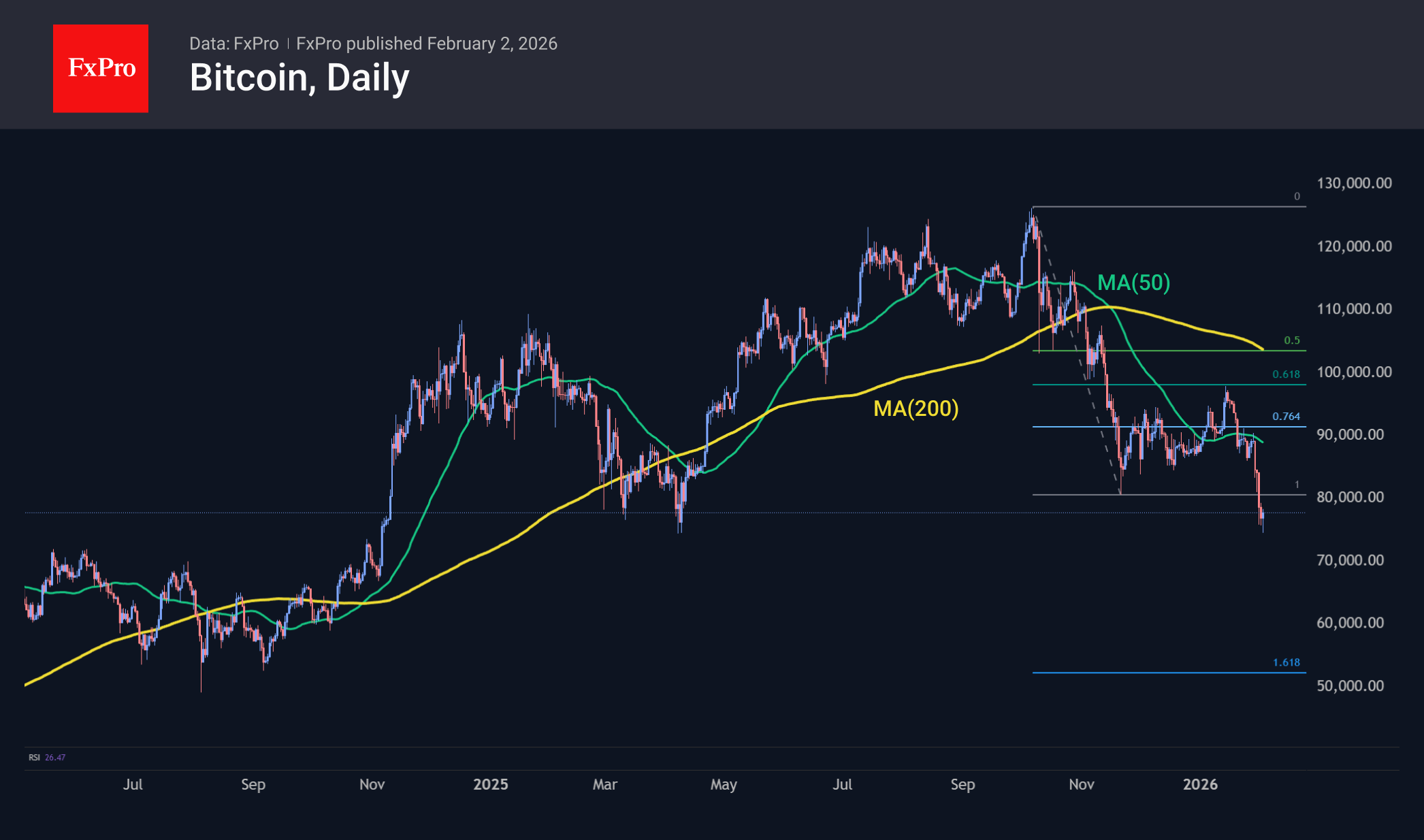 Биткоин торгуется вблизи $78K, отскочив после утренней просадки ниже $75K. Из этой же области первая криптовалюта начинала восстановление в апреле, что, вероятно, послужило триггером для смелых покупателей. Мы считаем важным медвежьим сигналом, что BTC начал активно распродаваться после неудачной попытки закрепиться над 50-дневной средней. Основным сценарием для рынков теперь может стать падение по направлению к $50K в ближайшие полтора-два месяца.
