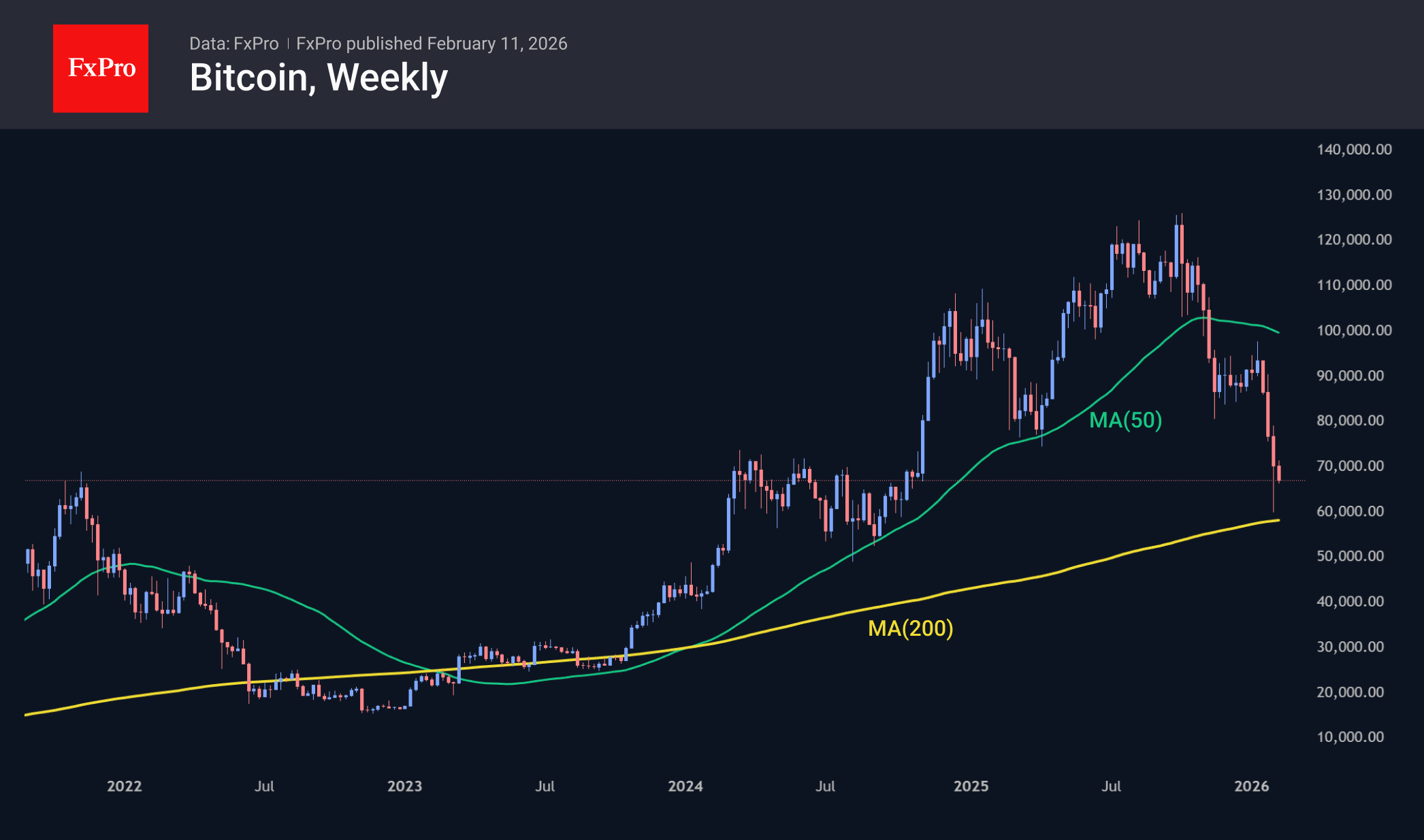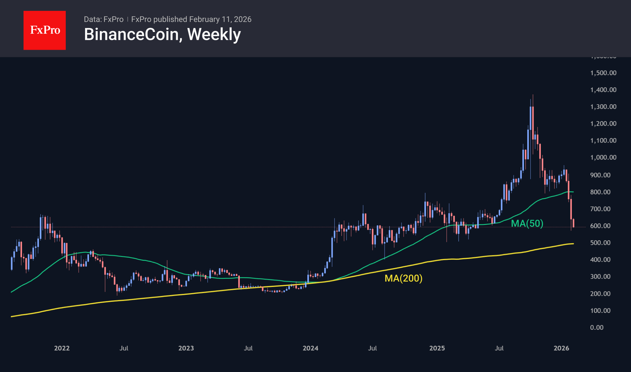 BNB стал тяжелее рынка, теряя почти 6% за последние 24 часа и свыше 21% за семь дней, примерно вдвое обгоняя темпы спада BTС и ETH. На уровнях ниже $600 эта монета оказалась в области поддержки прошлого года, откуда её активно выкупали на спадах. Но техническая ситуация более мрачная, так как в 2025 году покупатели также находили поддержку на спадах к 50-недельной скользящей средней, но в этом году медведи продавили цену ниже этой линии в конце января, после чего мы видим обильную распродажу. Это может быть лишь прологом к ценой ещё 50% до $300.