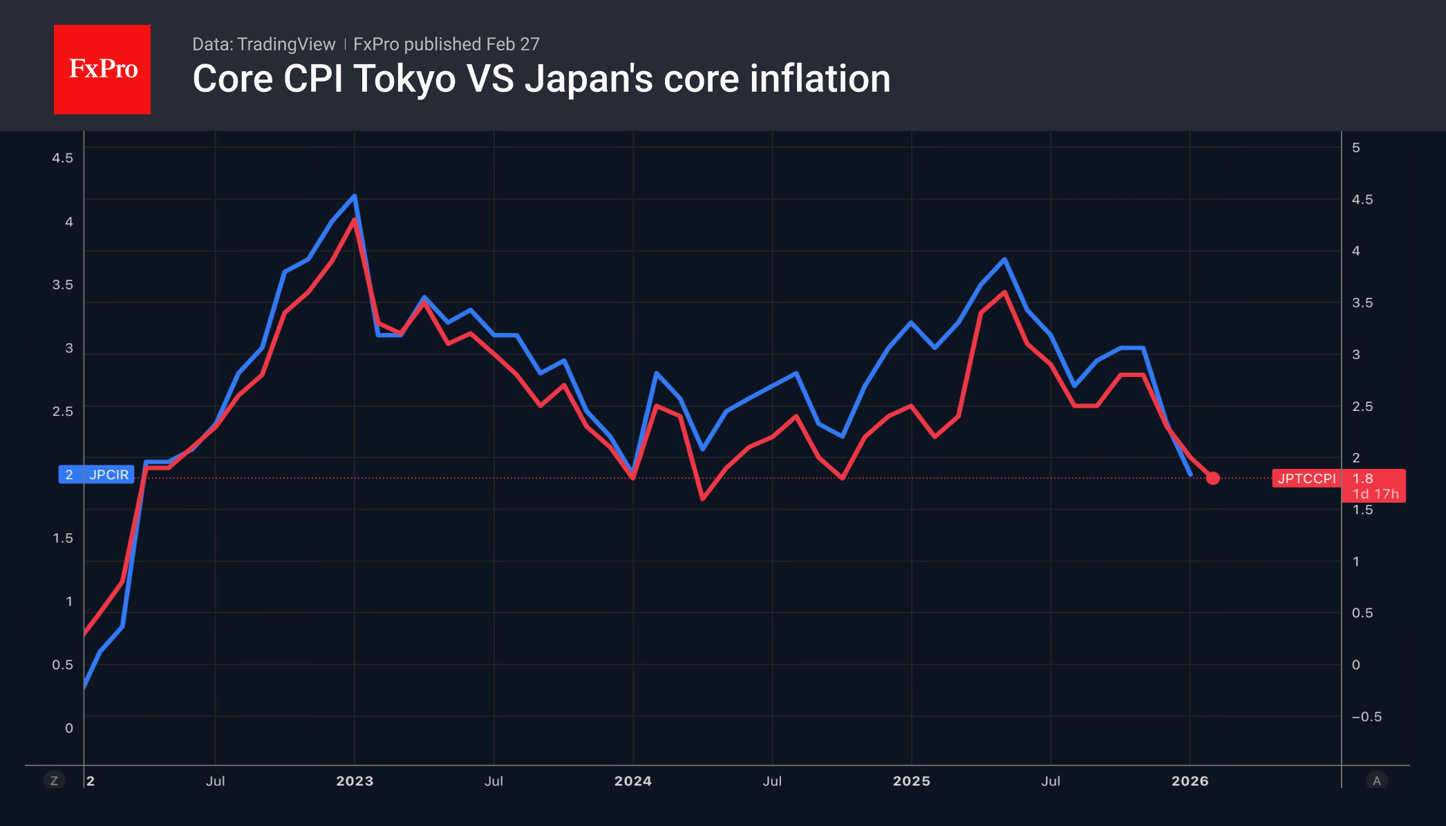 Впрочем, пока гринбэк сдаваться не намерен. На его стороне играет продолжительная пауза ФРС в цикле снижения. При этом доходности долларовых активов остаются высокими при сохранении уязвимости валют-конкурентов. Так, впервые с октября 2024 базовая инфляция в Токио упала до 1.8%, что ниже таргета Банка Японии. Эта статистика рассматривается как опережающий индикатор для национальной инфляции и может лишить медведей по USDJPY важного козыря, так как выступает против аргументов дальнейшего повышения ставки для нормализации политики.
