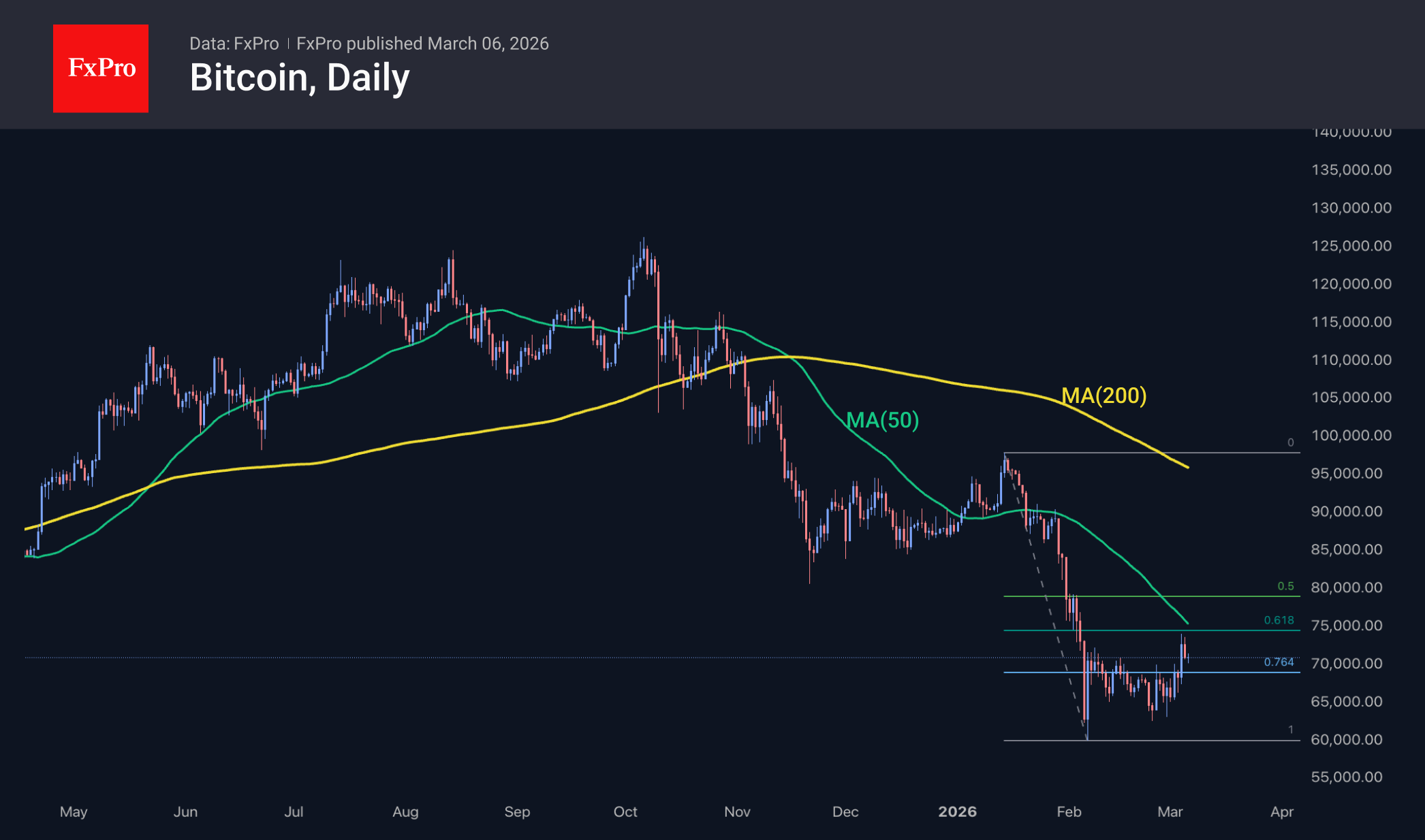 Биткоин осторожно отступает второй день до $70.5K, натолкнувшись на область сопротивления и исчерпав импульс роста на ликвидации коротких позиций пару дней назад. Краткосрочными препятствиями для роста стали 50-дневная скользящая средняя и уровень 61.8% от снижения с 14 января по 6 февраля. Медведи доказывают, что держат ситуацию под контролем, сохраняя Биткоин внутри коррекционного диапазона. В таких условиях выше шансы движения к нижней границе диапазона, что можно назвать типичным поведением для конца недели в последние месяцы.