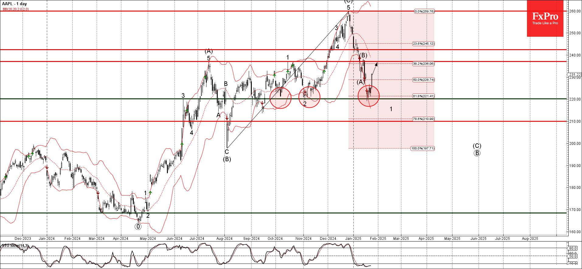 Apple недавно развернулась вверх от зоны поддержки, расположенной между ключевым уровнем поддержки 220,00 (который несколько раз развернул цену с октября), нижней дневной полосой Боллинджера и 61,8% коррекцией Фибоначчи резкого восходящего импульса (C) от августа.