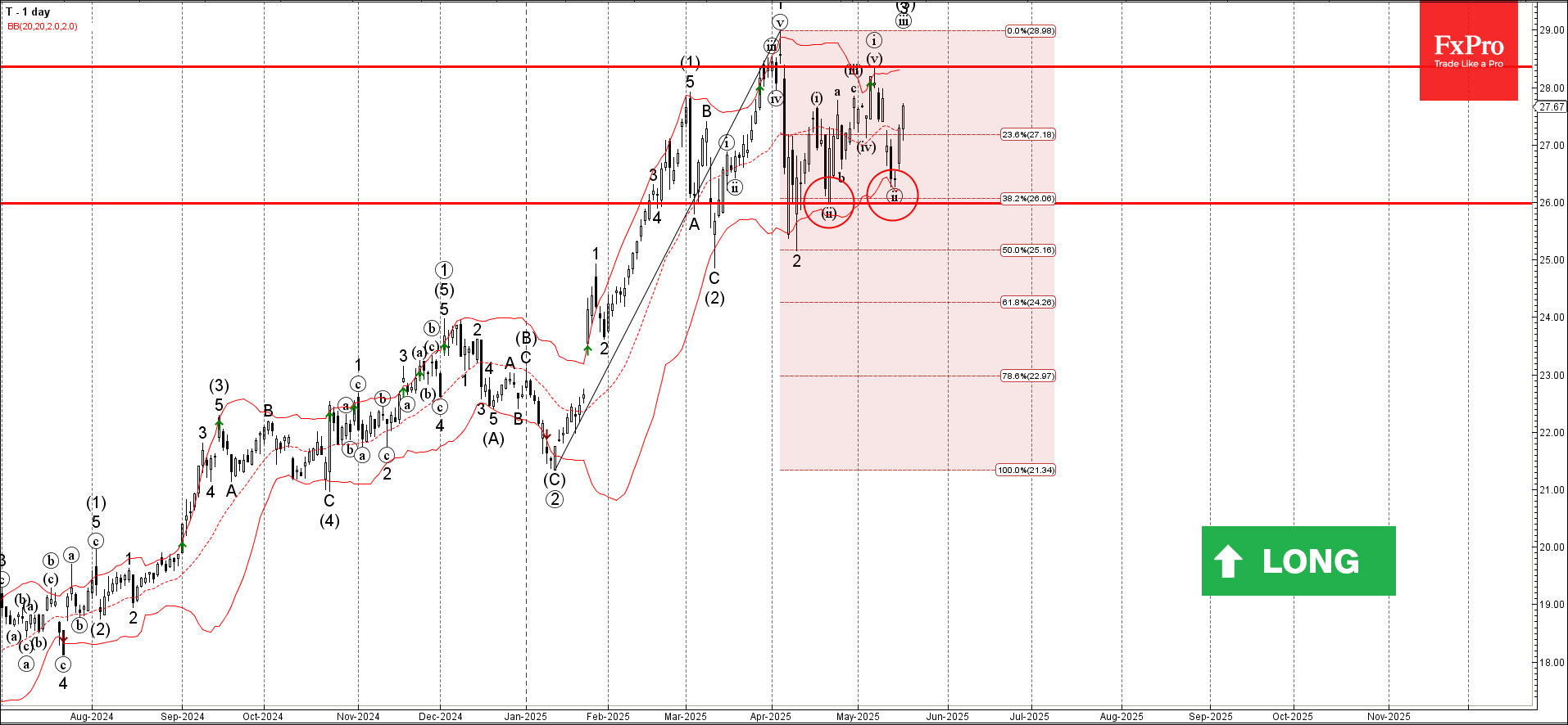 Учитывая сильный дневной восходящий тренд, можно ожидать, что AT&T продолжит рост до следующего уровня сопротивления 28,35, который развернул предыдущую импульсную волну i.