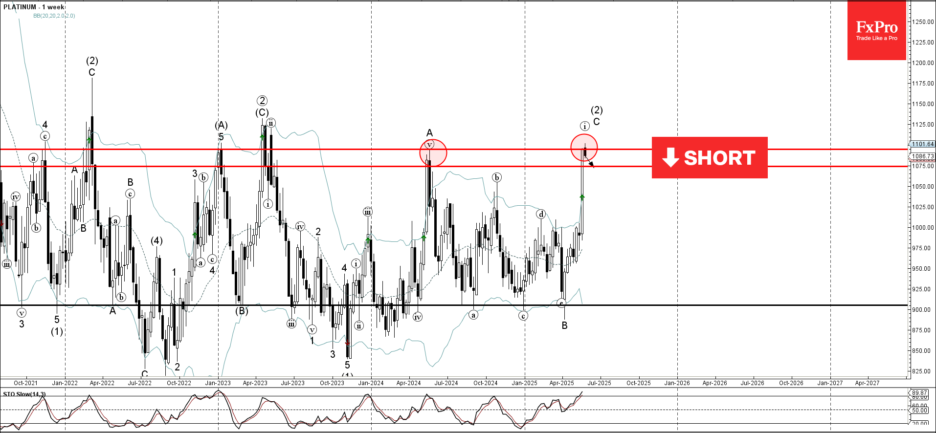 Платина недавно развернулась вниз от долгосрочного уровня сопротивления 1095,00 (бывшая годовая вершина от 2024 года), который остановил предыдущую недельную импульсную волну A.