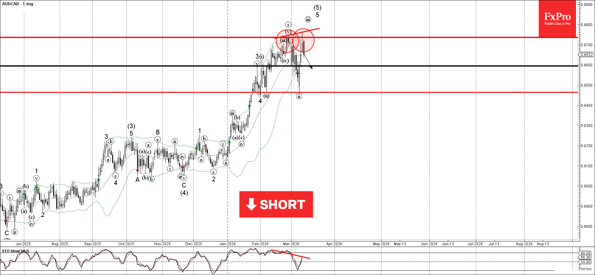 Валютная пара AUDCAD развернулась от зоны сопротивления, расположенной между ключевым уровнем сопротивления 0.9735 (который остановил волну i в конце февраля) и верхней дневной полосой Боллинджера