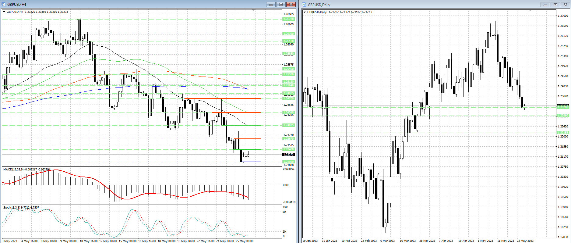 Курс валютной пары значительно ниже скользящих средних с периодами 34, 55, 89 и 144, которые направлены вниз и указывают на сохраняющиеся медвежьи настроения (в среднесрочной перспективе), а также являются рядом уровней сопротивления 1.2401, 1.2434 и 1.2493/95.
