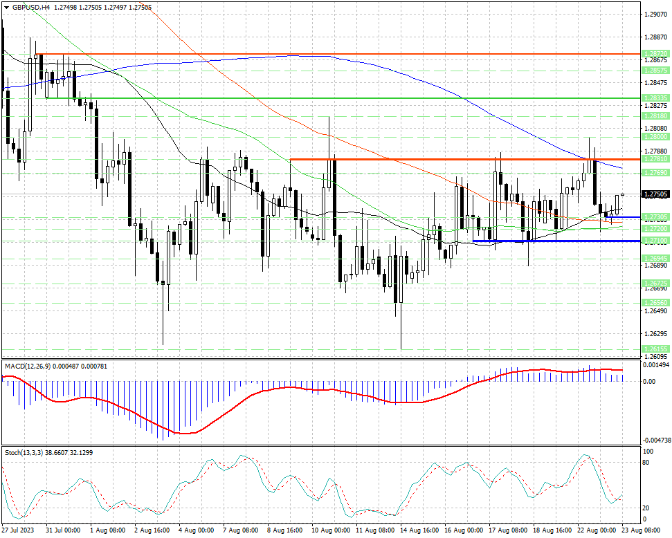 Курс валютной пары зажат между скользящей средней с периодом 144 (уровень сопротивления 1.2773) с одной стороны и средних с периодами 34, 89 и 55 (ряд уровней поддержки 1.2738, 1.27265 и 1.2723) с другой.