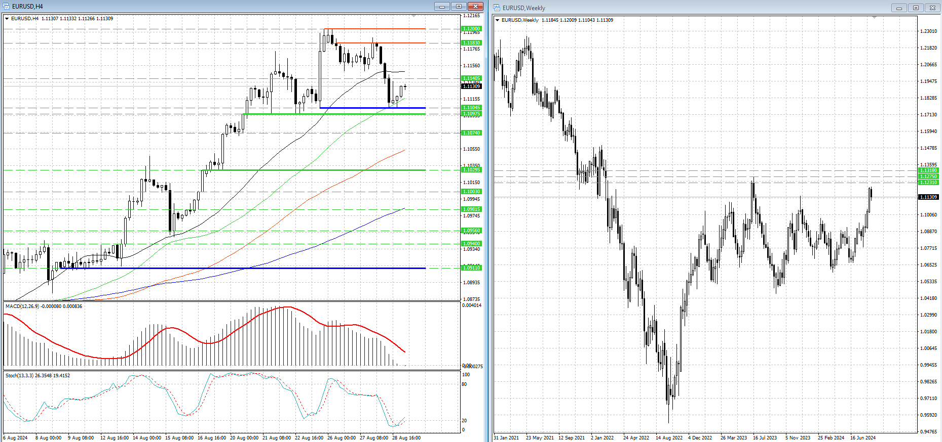 Курс валютной пары уже зажат между скользящей средней с периодом 34 (уровень сопротивления 1.1149) с одной стороны и средних с периодами 55, 89 и 144 (ряд уровней поддержки 1.11165, 1.1054 и 1.09835) с другой.