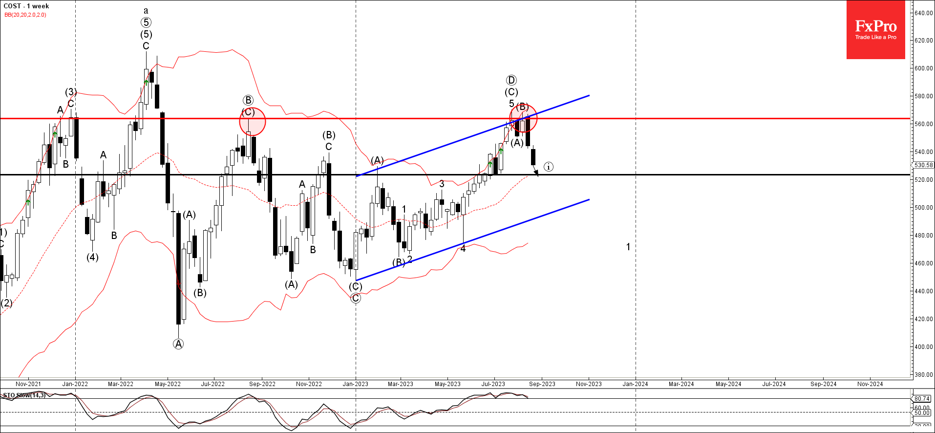 Costco продолжает падение внутри импульсной волны i недельной импульсной волны (C), которая началась ранее от сильного уровня сопротивления 564,00.
