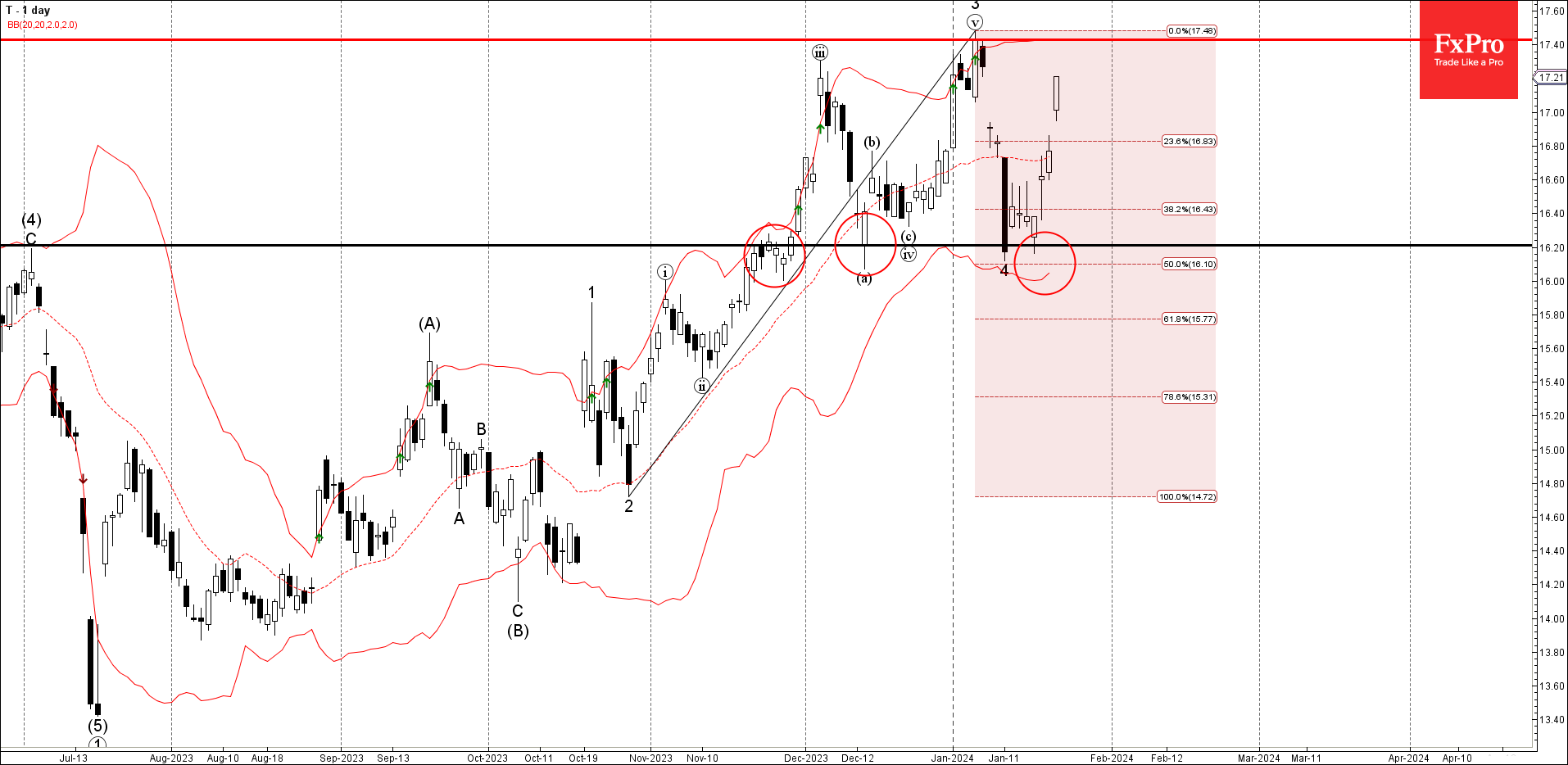 Учитывая силу дневного восходящего тренда, можно ожидать дальнейшего роста акций AT&T до следующего уровня сопротивления 17,40 (вершина предыдущей импульсной волны 3).