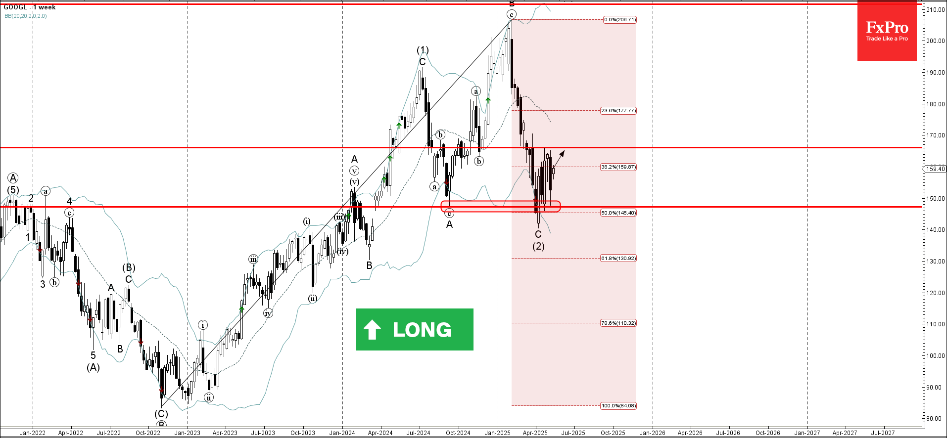 Учитывая недельный восходящий тренд, можно ожидать, что Google продолжит рост до следующего уровня сопротивления 166,15 (бывшая поддержка от конца 2024 года).
