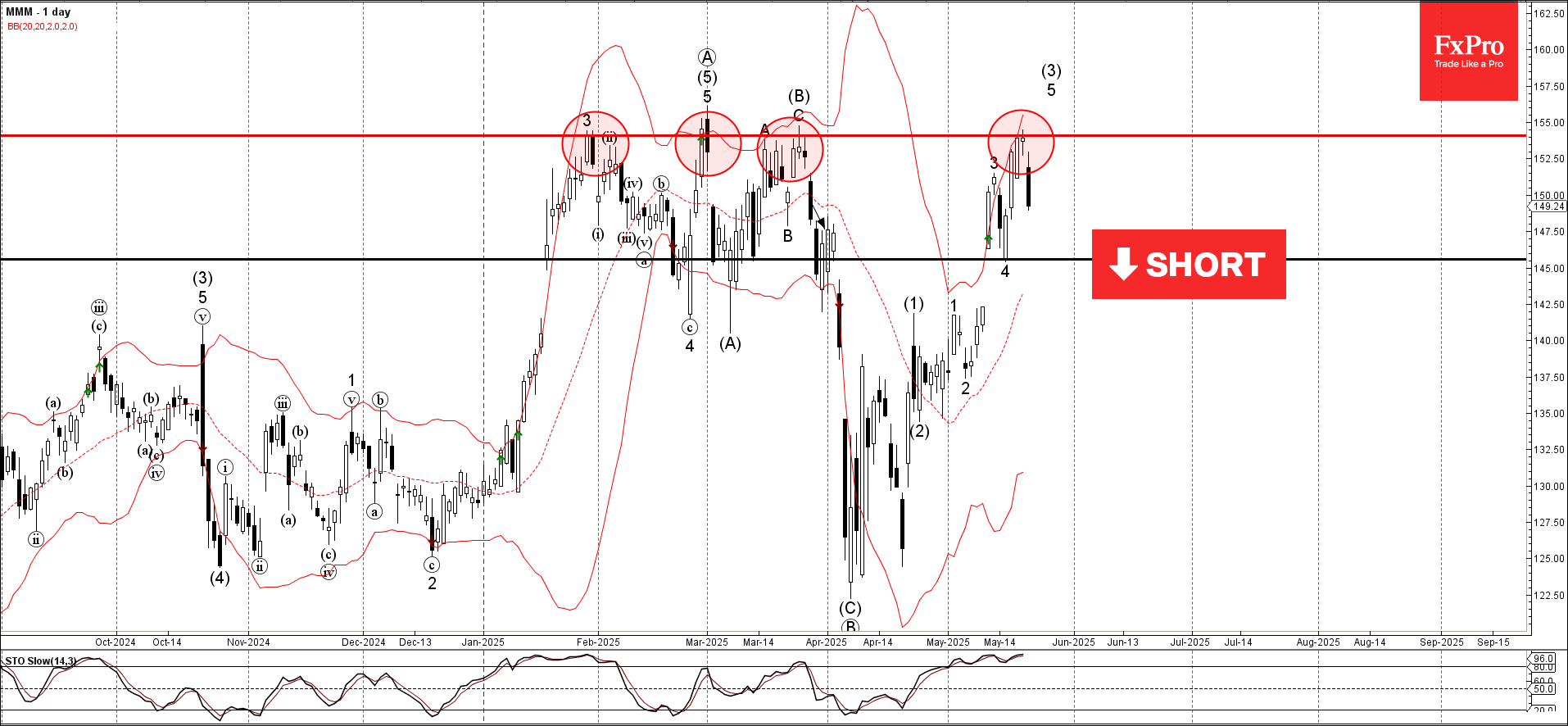 3M развернулся вниз от многомесячного уровня сопротивления 154,00 (который разворачивает цену с конца января), пересекающийся с верхней дневной полосой Боллинджера.