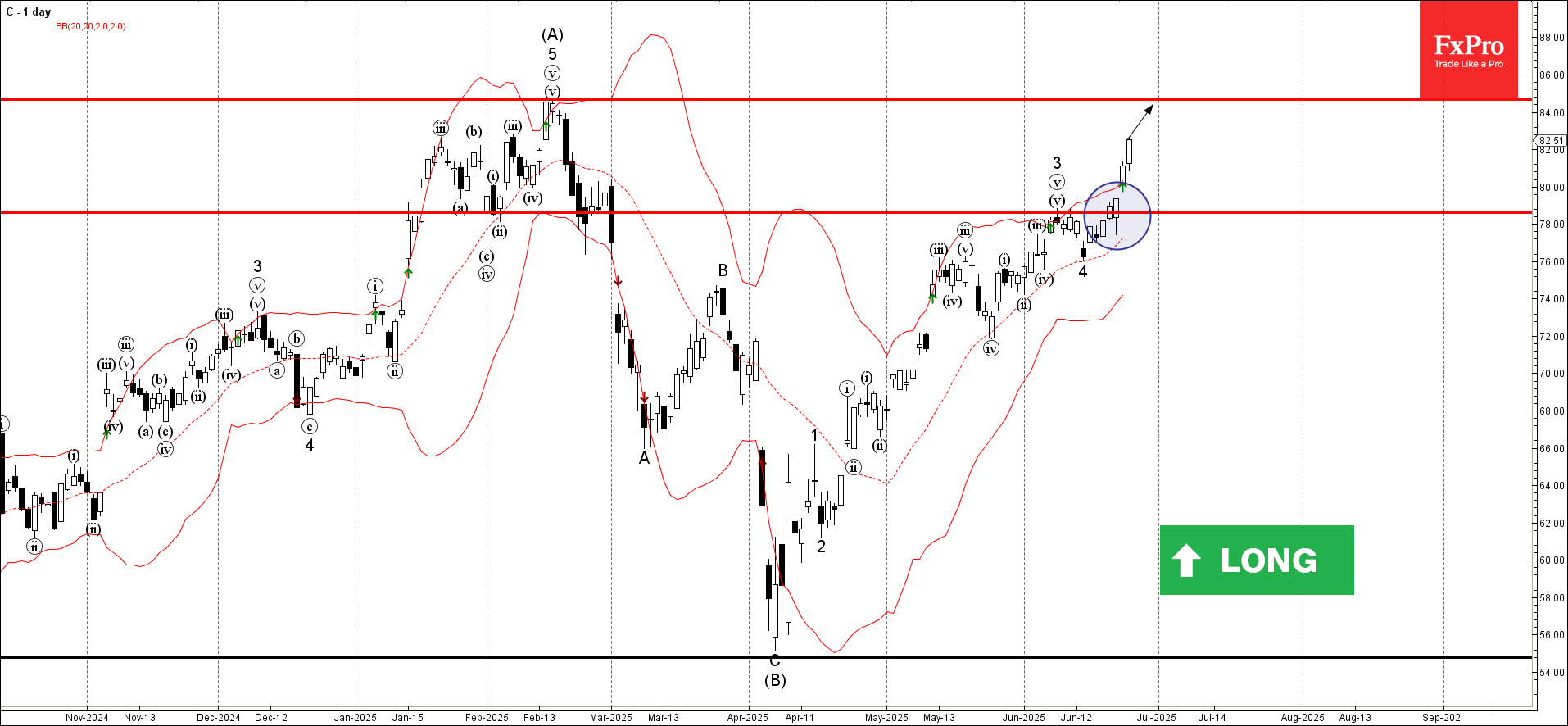 Citigroup недавно прорвал уровень сопротивления 78,60, который остановил предыдущую импульсную волну 3 в начале июня.