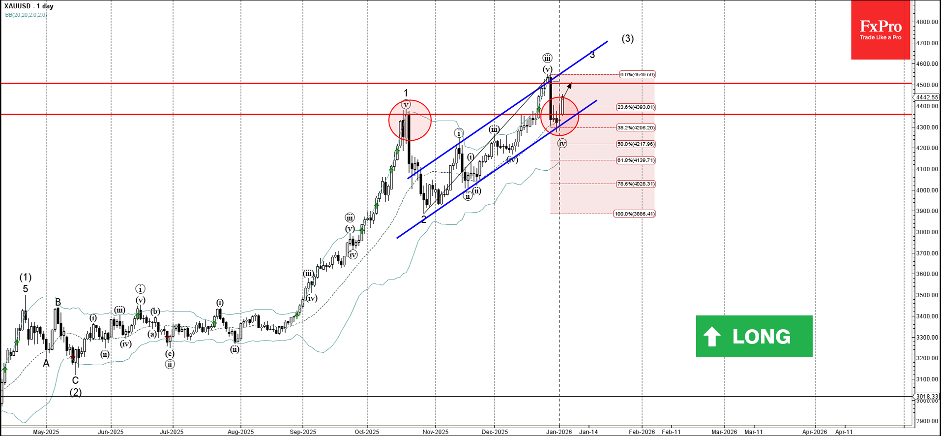 Золото развернулось вверх от зоны поддержки между уровнем поддержки 4360,00 (бывшее сильное сопротивление от октября) и линией поддержки дневного восходящего канала от октября.