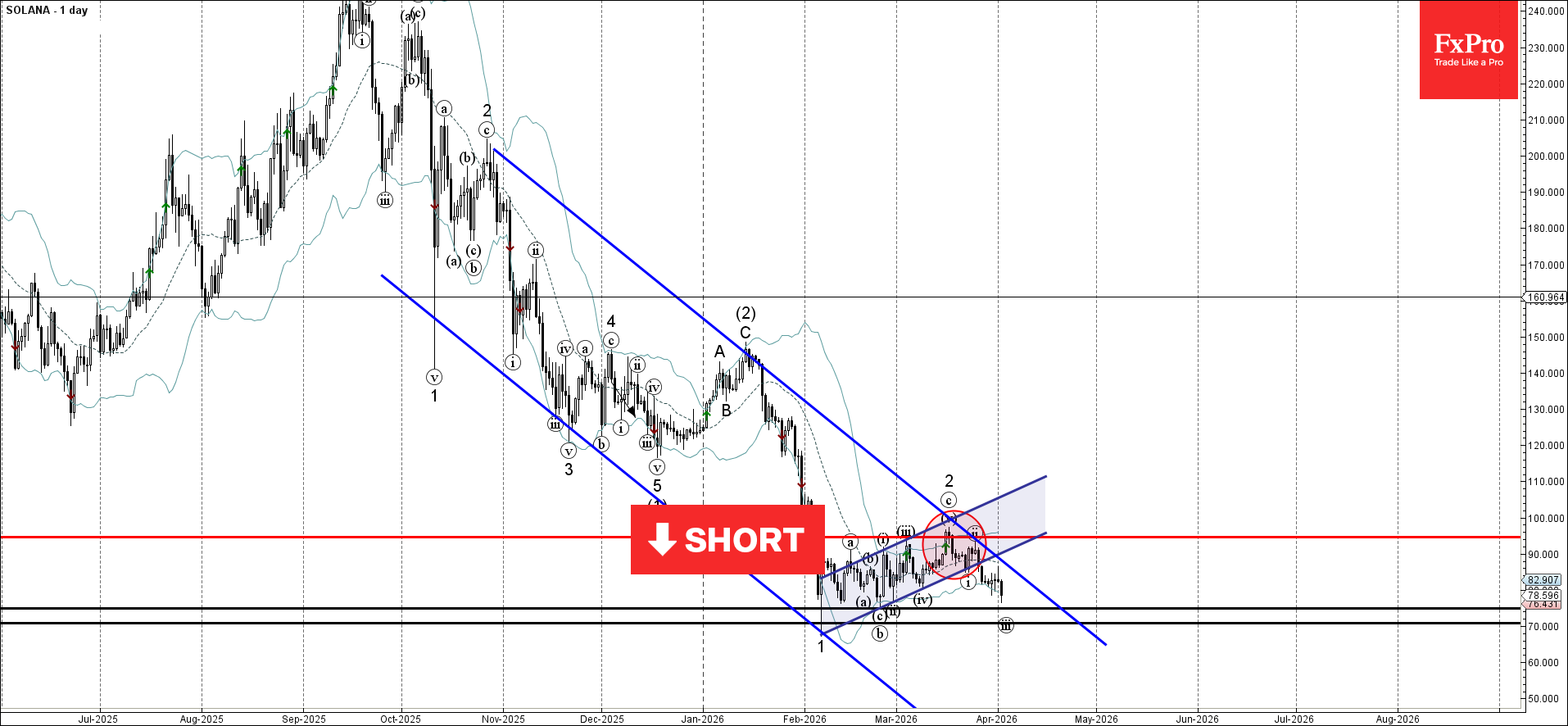 Учитывая явный дневной нисходящий тренд, можно ожидать, что криптовалюта Solana упадет до следующих уровней поддержки 75,00 и 70,00.