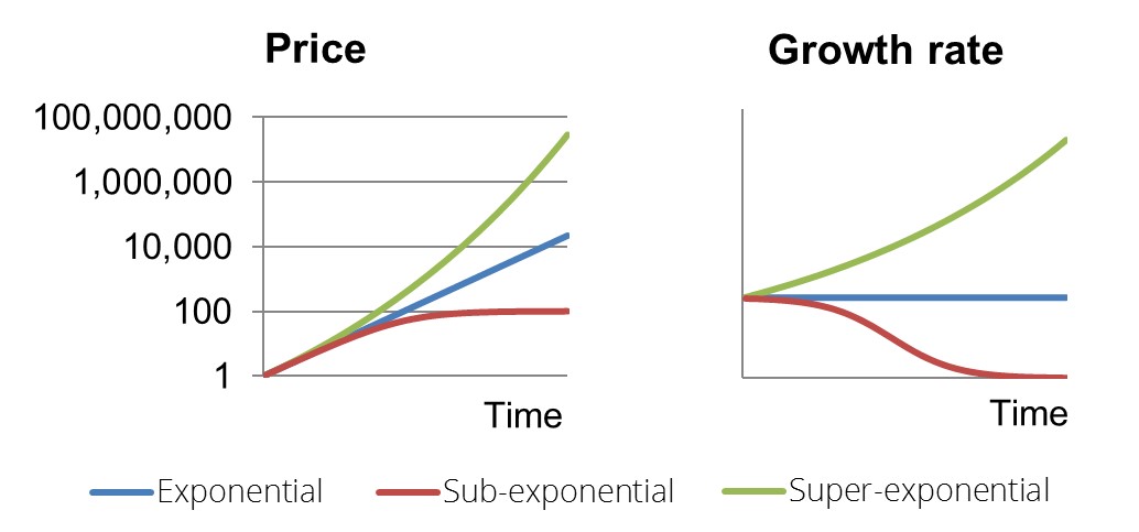 Экспоненциальный рост отображается на логарифмическом графике прямой линией, что соответствует постоянному темпу роста. Супер-экспоненциальный рост отображается на графике кривой, загибающейся вверх, и указывает на надувание «пузыря». Субэкспоненциальный рост означает замедление роста, при котором темп замедления постепенно снижаеся.